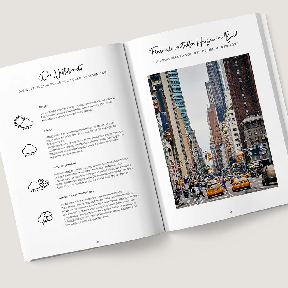 Besonders einfach ist es, dem Bild kleine Icons, Symbole oder Elemente zu ergänzen, die man finden muss. In unserem Online-Gestaltungs-Tool für die Hochzeitszeitung gibt es dafür unzählige Symbole zu allen Themen.