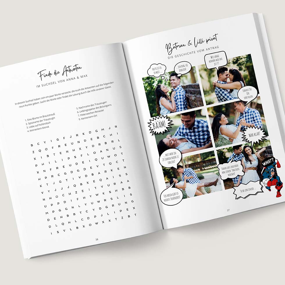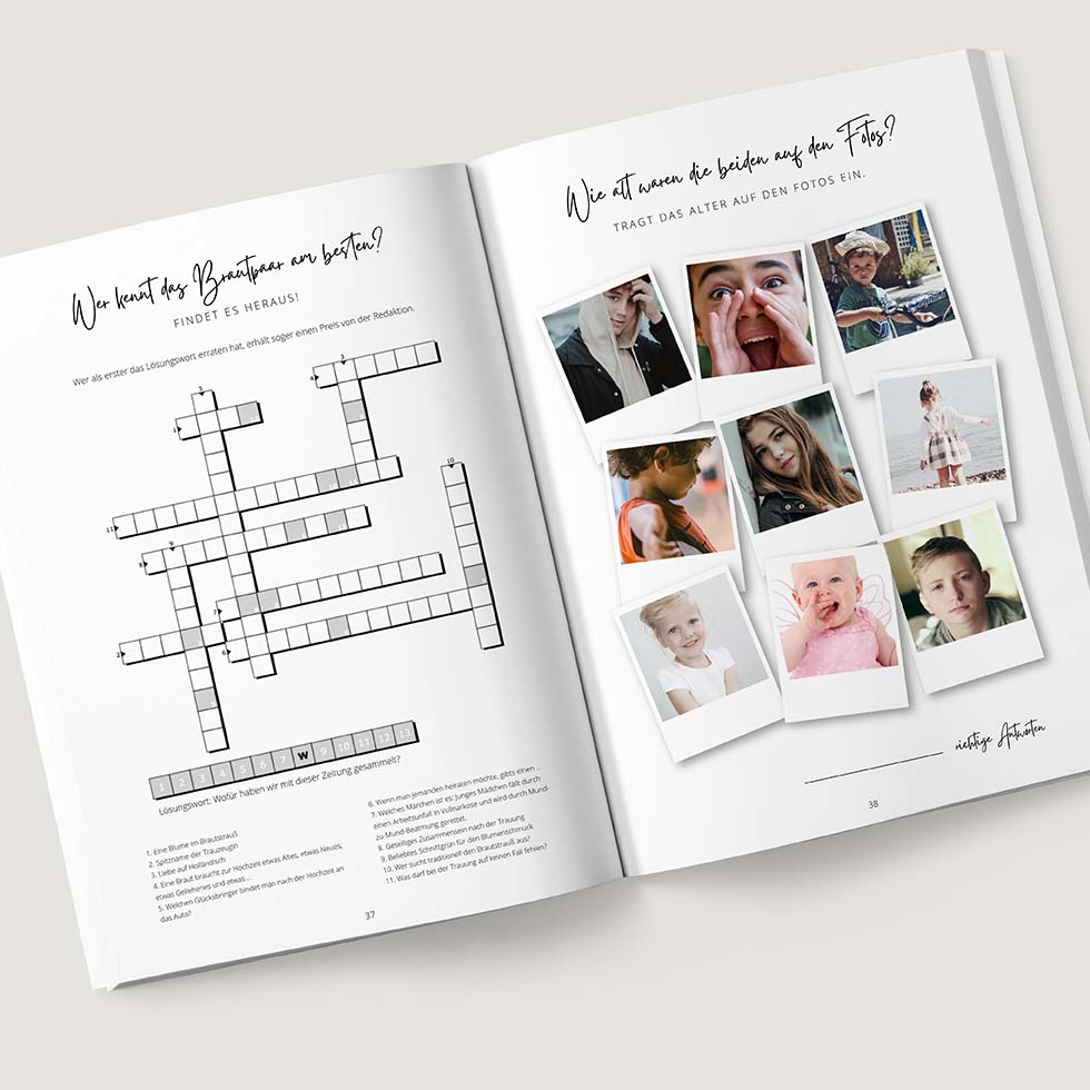 All diese Spiele sind bereits in unserer Hochzeitszeitung Vorlage beinhaltet: liebevoll gestaltete Kreuzworträtsel, Quizze und Suchsel – personalisierbar, druckbereit & voller Rätselspaß.