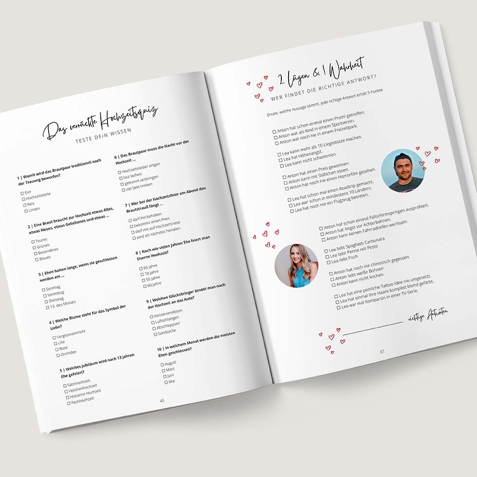 Ideen zu ganz persönlichen Quiz-Fragen zum Brautpaar erhaltet ihr mit unseren Hochzeitsquiz-Vorlagen, die ihr ruckzuck personalisieren und in jede Hochzeitszeitung einbinden könnt: