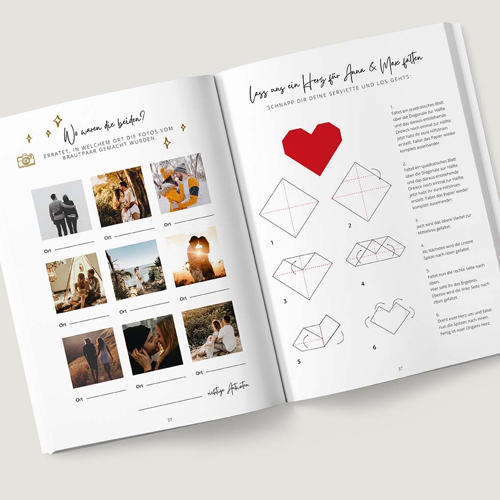 Nutzt dafür persönliche Fragen, kleine Anekdoten oder lustige Details aus dem Leben des Paares, um ein ganz individuelles Rätsel zu gestalten.