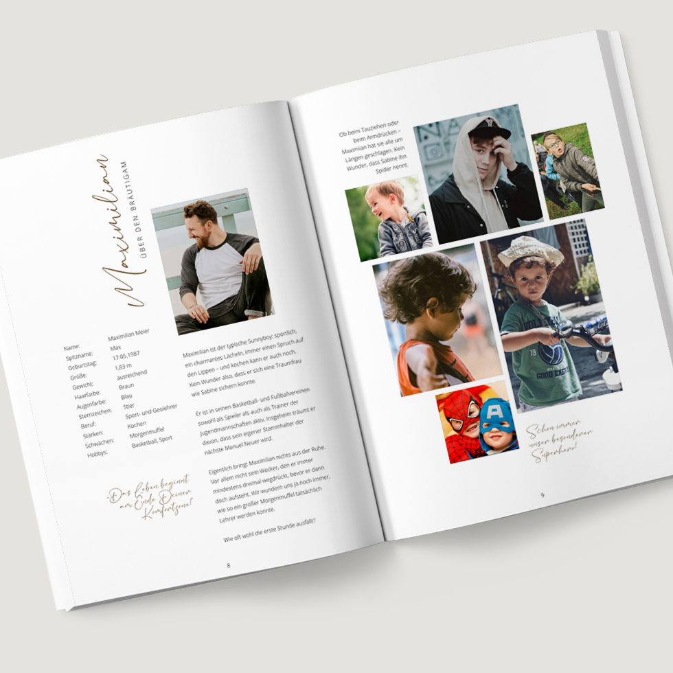 Wer könnte besser als die Eltern schöne Fotos und Text-Anekdoten vom Brautpaar zusammentragen? Diese können wunderbar als Fotocollagen oder Foto-Reportage-Seiten ergänzt werden.