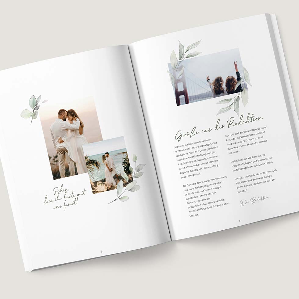 Das hängt ganz von eurem Zeitplan und euren Ideen ab. Die meisten Hochzeitszeitungen haben zwischen 24 und 48 Seiten – aber auch eine Mini-Zeitung mit 4 Seiten kann großartig sein.