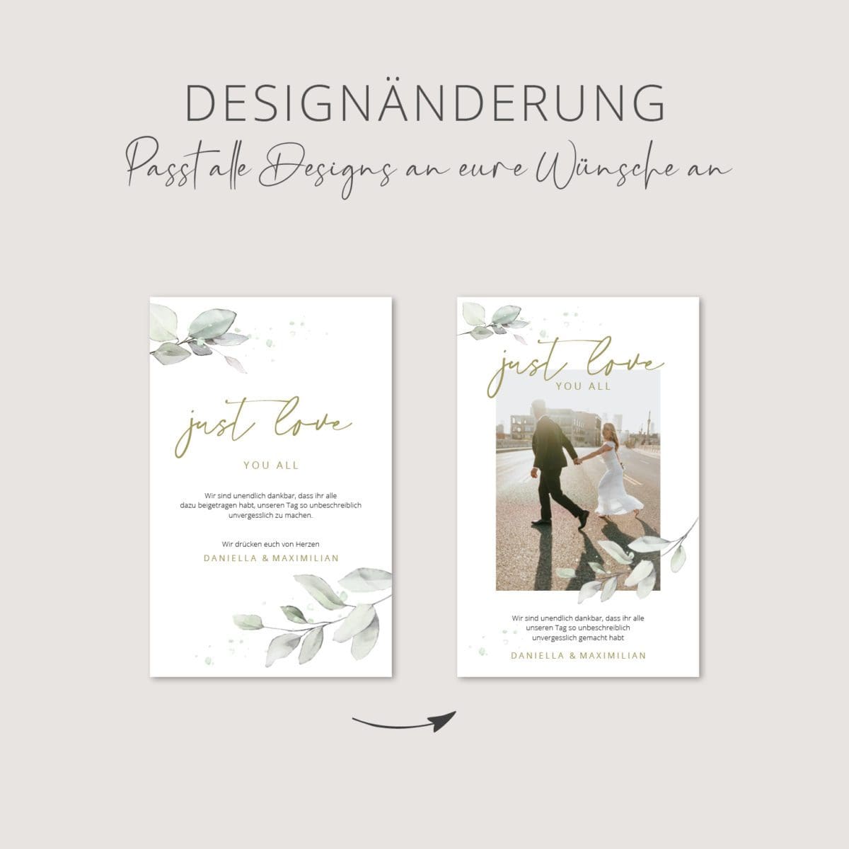 Auf der einen Seite ist euer Hochzeits-Layout sowie eine handschriftlich ergänzte Danksagung für das spezielle Geschenk enthalten.
