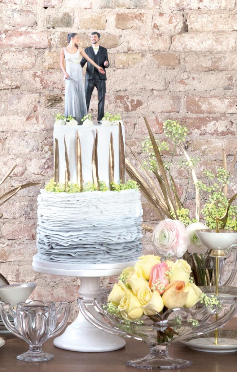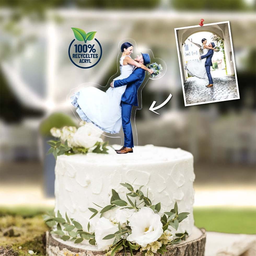 Diese Cake Topper könnt ihr mit Fotos oder Schriftzügen ganz individuell gestalten und nach der Hochzeit als Figur aufstellen.
