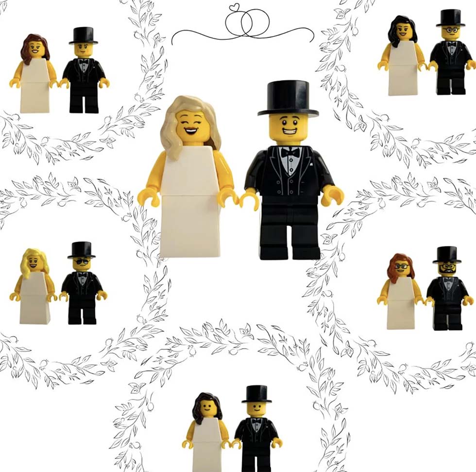 Für Lego-Fans gibt es ein richtig witzige Torten-Topper-Variante mit individuellen Figuren, bei denen ihr die Haare und Gesichter sowie einen Traubogen individuell wählen könnt: