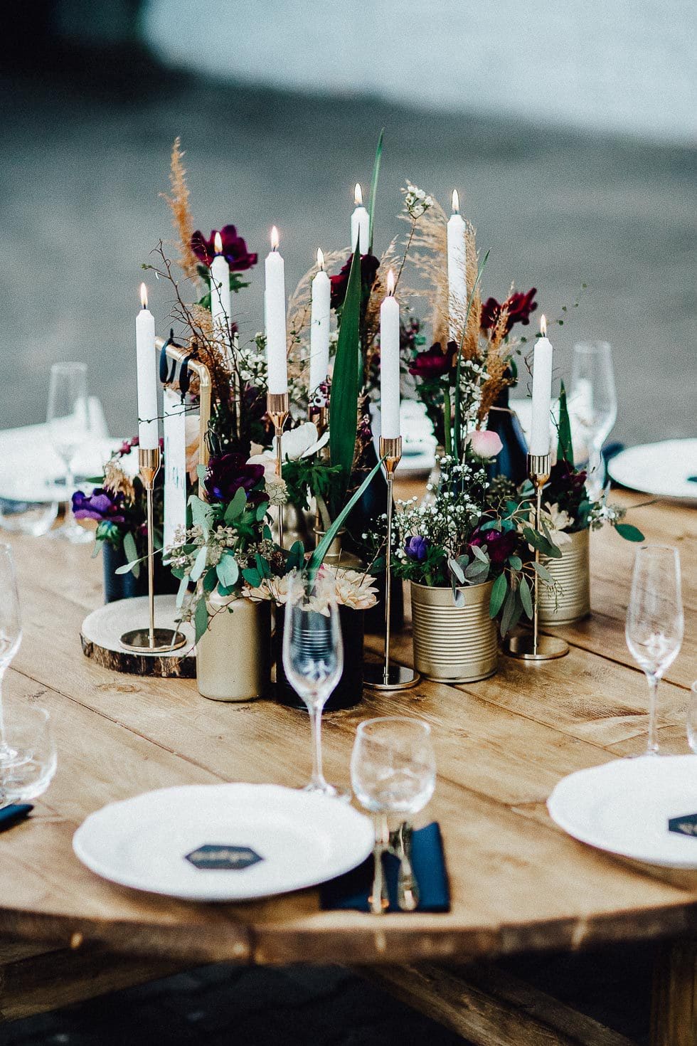 Es sind die herrlich kreativen, perfekt passenden Elemente, die diese Tischdekoration gemeinsam mit der Papeterie im Industrial Look so harmonisch wirken lassen. Dabei bieten die Tische aus grobem Holz in der alten Fabrikhalle die perfekte Basis.
