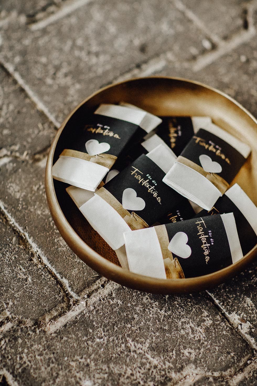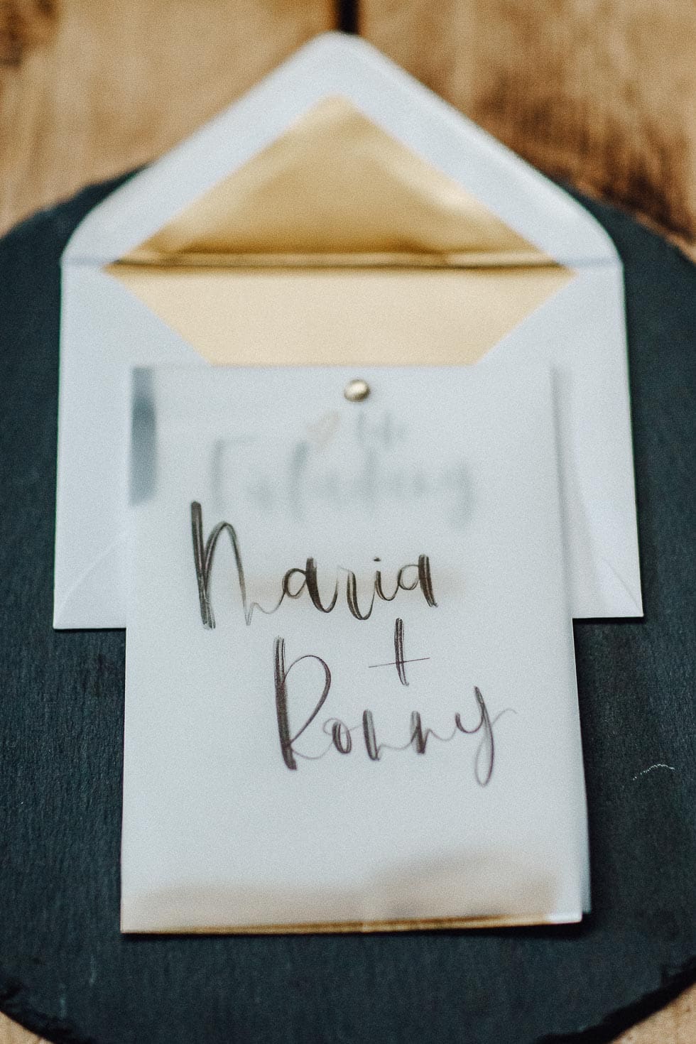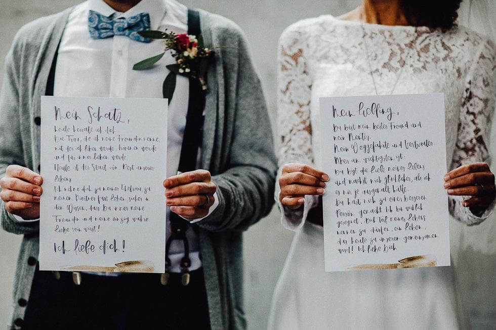 Nichts ist persönlicher als eine Handschrift. Schnappt euch deshalb einen feinen Pinsel sowie Wasserfarbe und schreibt euer Eheversprechen auf ein Blatt Papier. Noch ein paar goldene Pinselstriche dazu und schon habt ihr einen so schönen Spickzettel für euer Treueversprechen, das ihr es mit Sicherheit nach der Hochzeit gerne einrahmen möchtet.