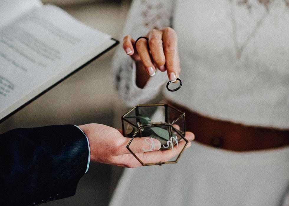 Als Ringkissen dient eine simple Schmuckschatulle aus Glas, die mit einem Kreidestift mit den Initialen des Brautpaars auf dem Decken beschriftet wurde. Und schaut ihr genau hin, entdeckt ihr die zu den beiden perfekt passenden, außergewöhnlichen Trauringe, die zwischen den Olivenblättern auf den Ringwechsel warten.