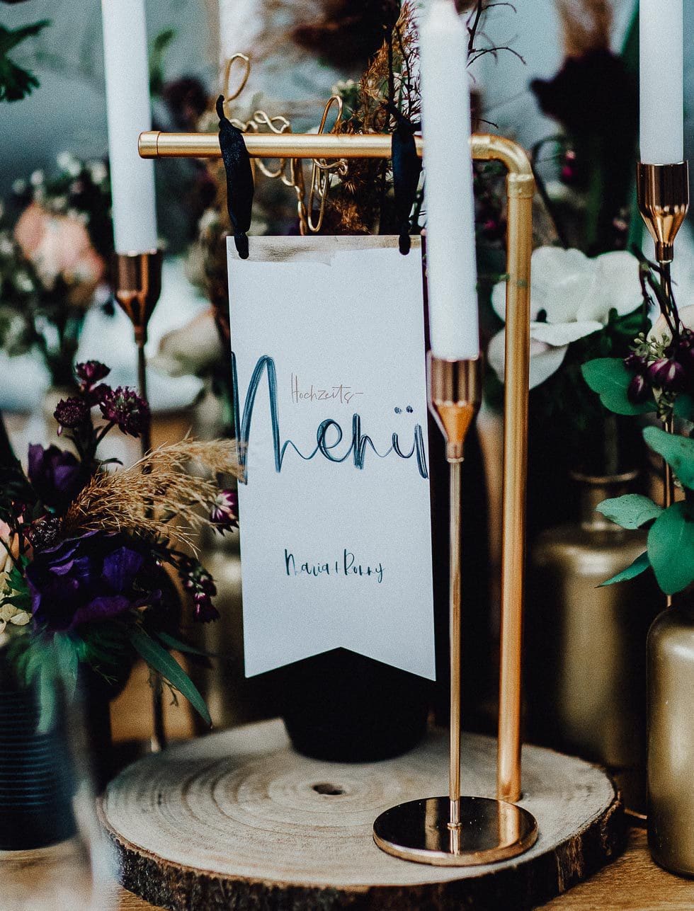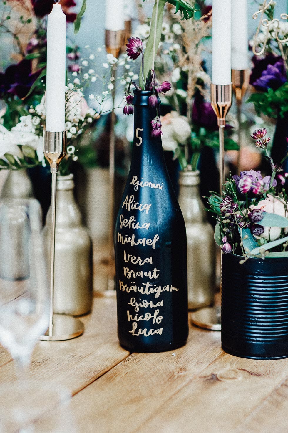 Auch hierfür hat sich das Kreativem so richtig ausgetobt und wundervoll passende Papeterie-Elemente gezaubert. So dient ein schwarzes Wandgitter* mit wundervoll beschrifteten Karten als Sitzplan und eine schwarz lackierte Flasche mit Goldschrift als Tischnummer.