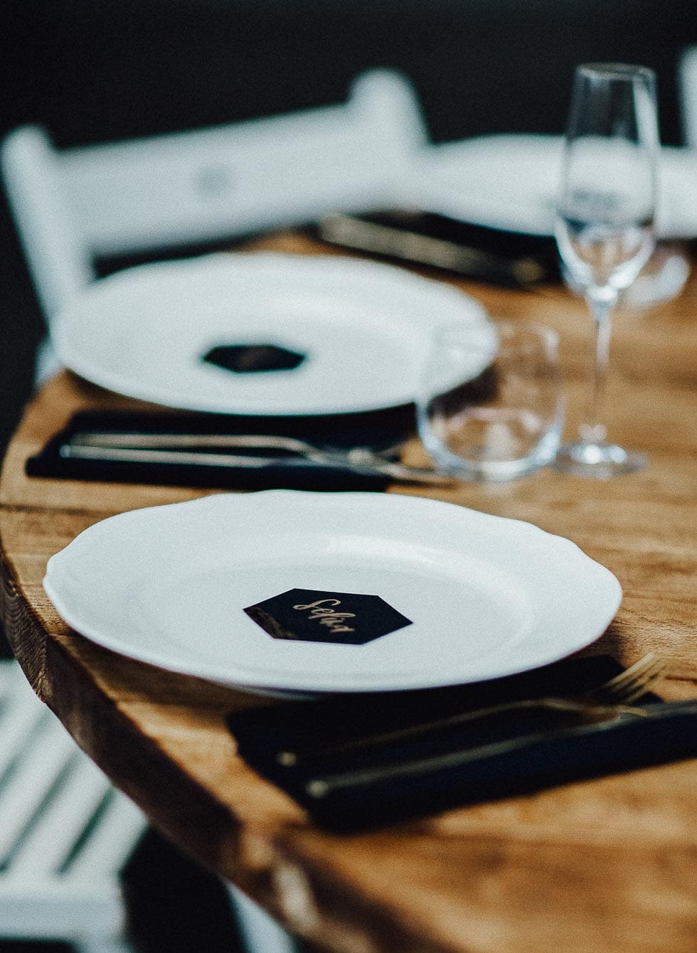 Und ein simpler schwarzer Bastelkarton wurde mit einem Hexagon-Stanzer* ausgestanzt und mit goldener Farbe und Pinsel mit den Vornamen der Gäste als Platzkarten beschriftet.