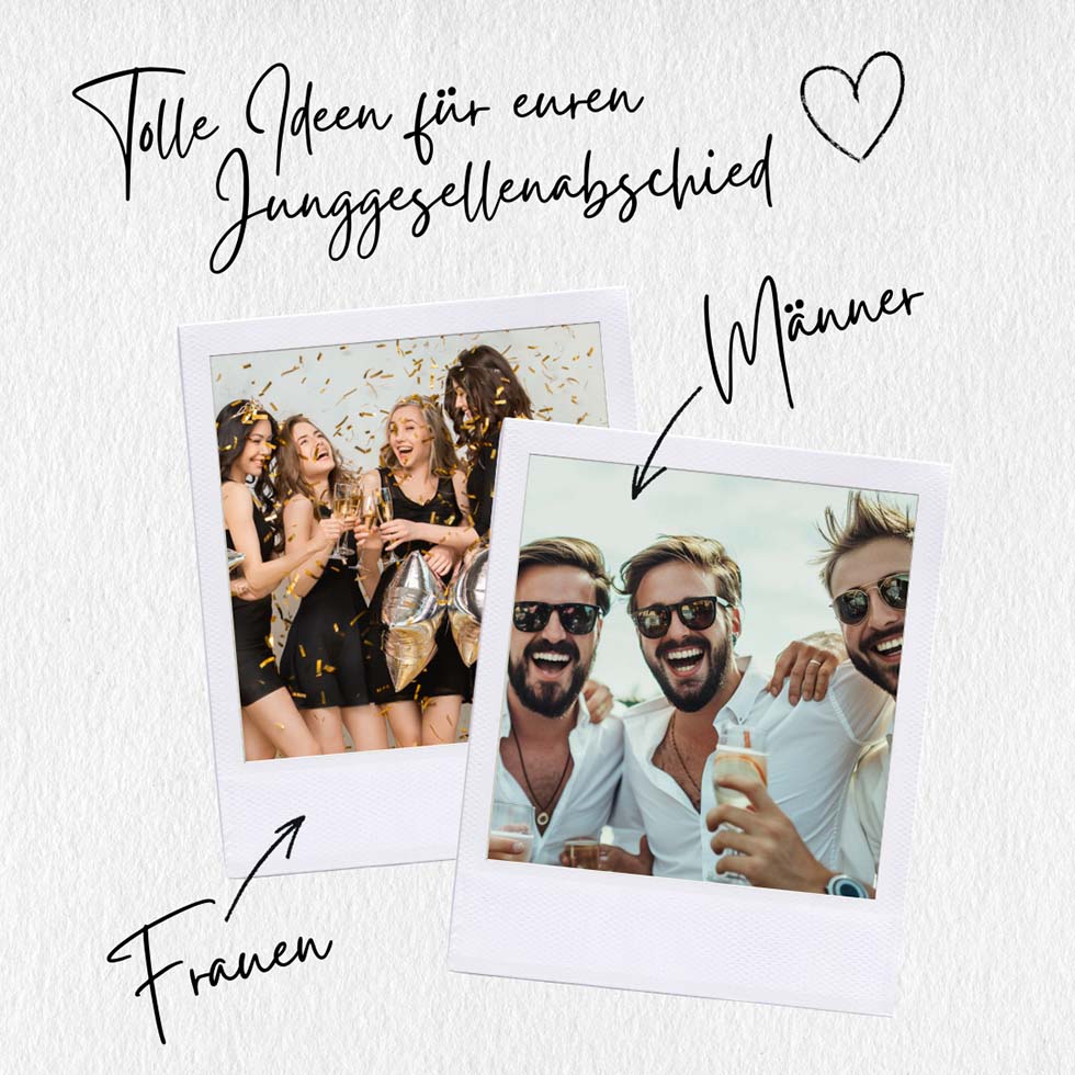 Findet die besten Inspirationen und Tipps für einen richtig genialen Junggesellenabschied: Mit tollen Aktivitäten, Spielen, Outfits, Accessoires und einer großen Portion Inspiration kommt ihr garantiert auf die besten Ideen für einen unvergesslich schönen, gelungenen JGA.