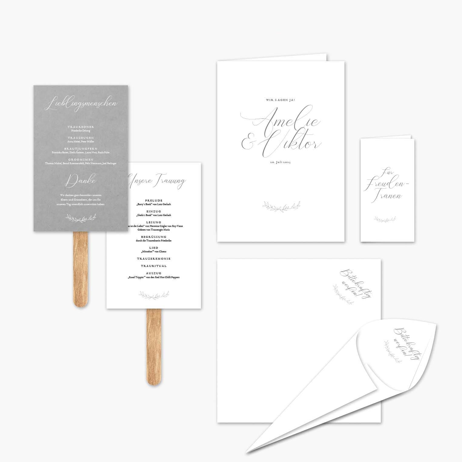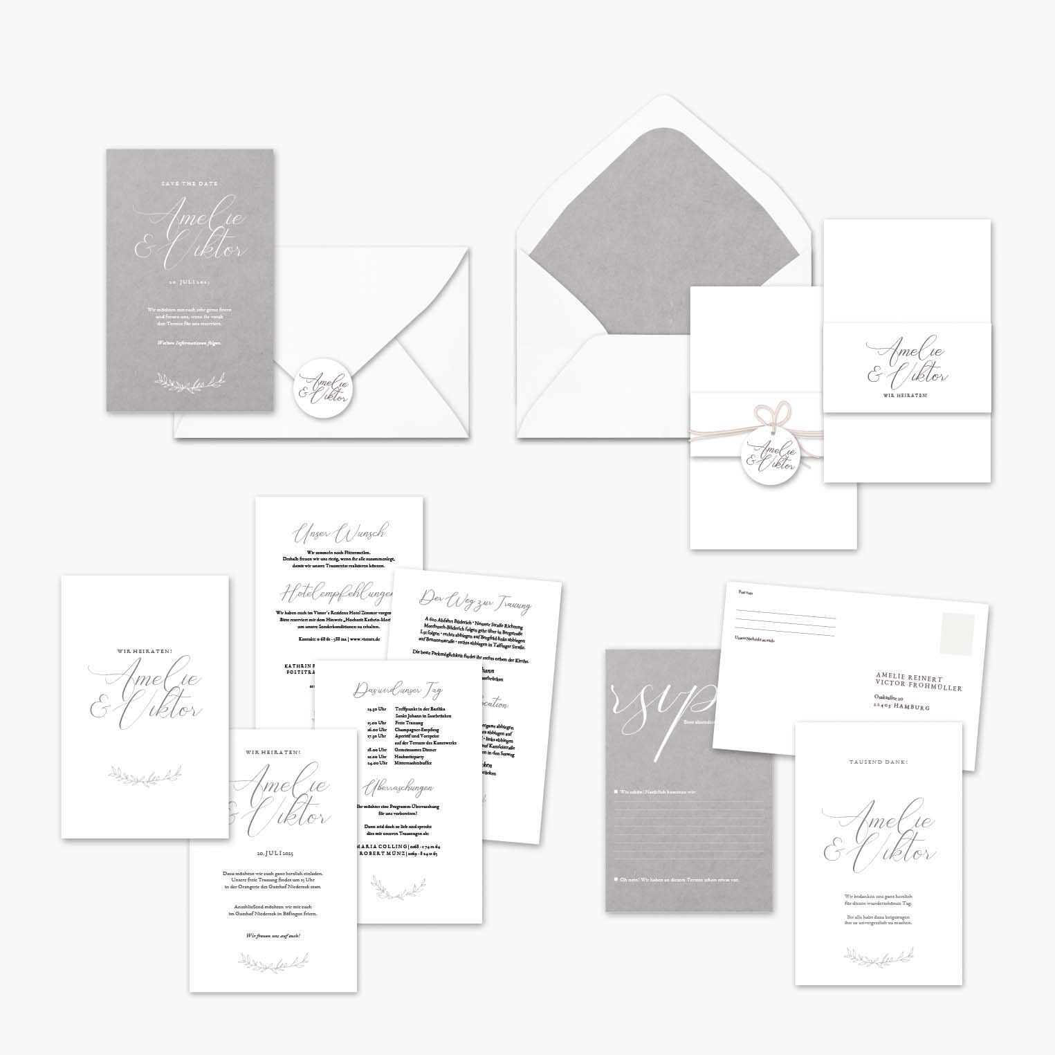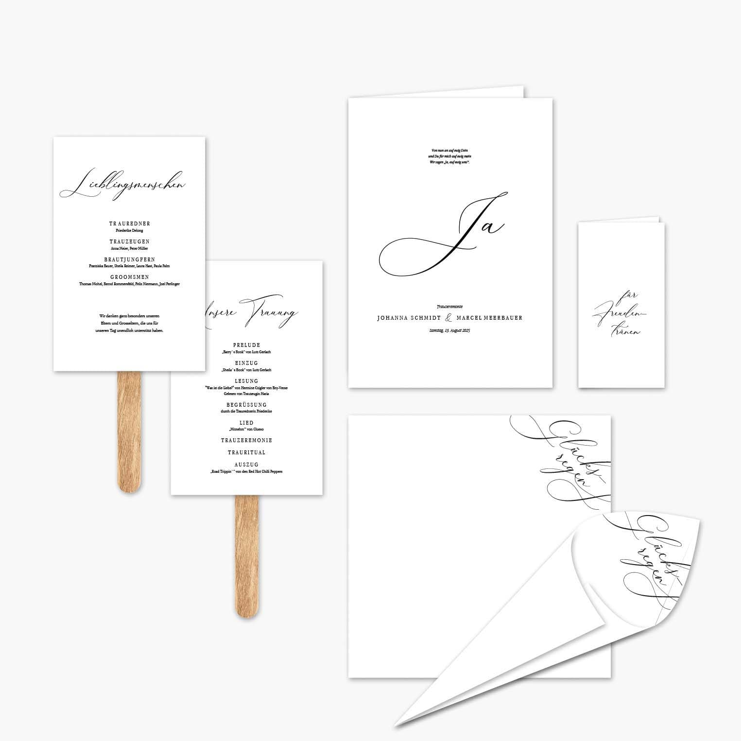 Karten und Accessoires zur Hochzeit, die mit Kalligraphie-Schrift gestaltet sind, haben den Vorteil, dass man sie problemlos miteinander kombinieren kann.