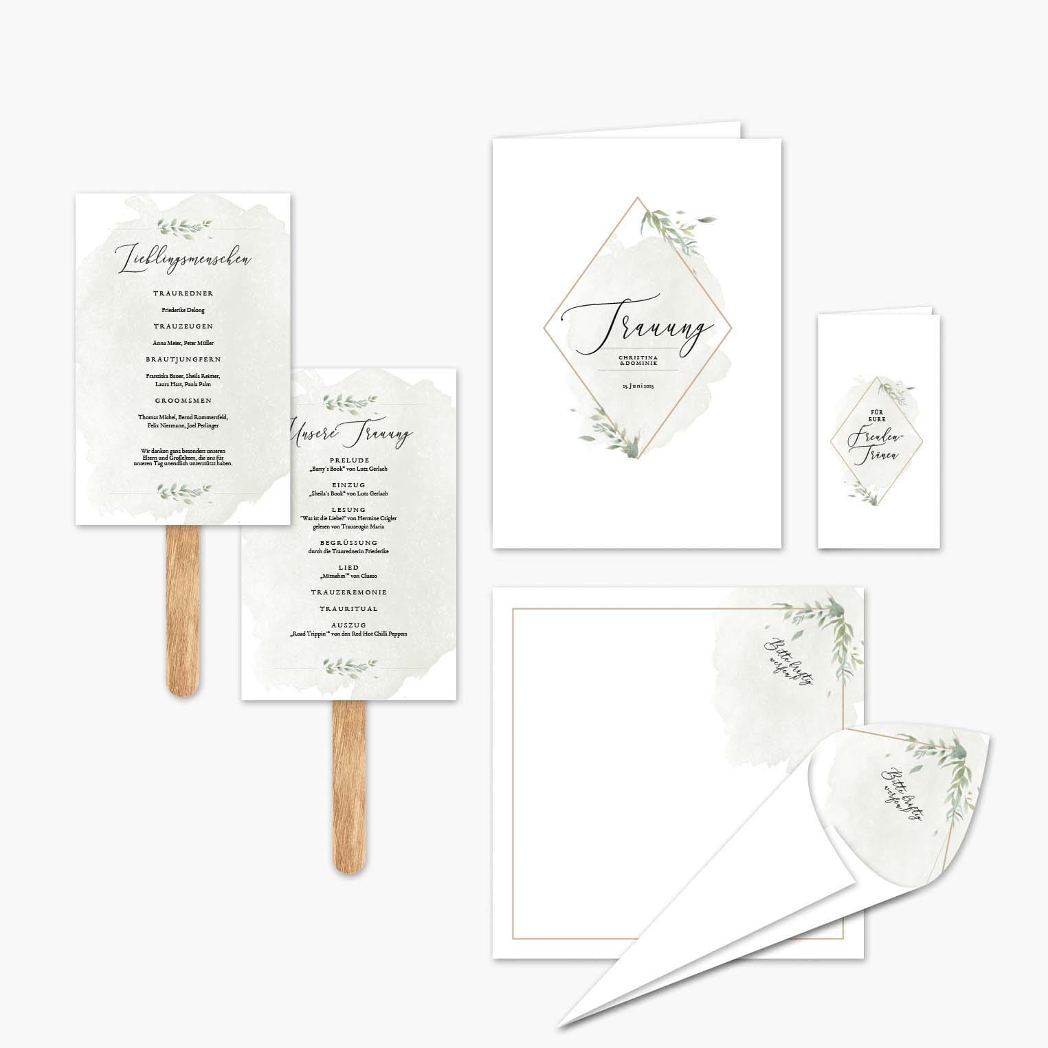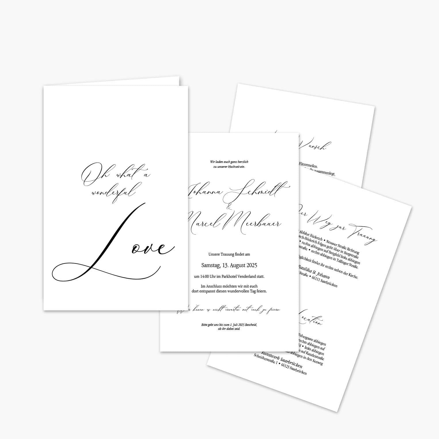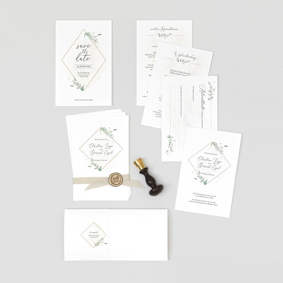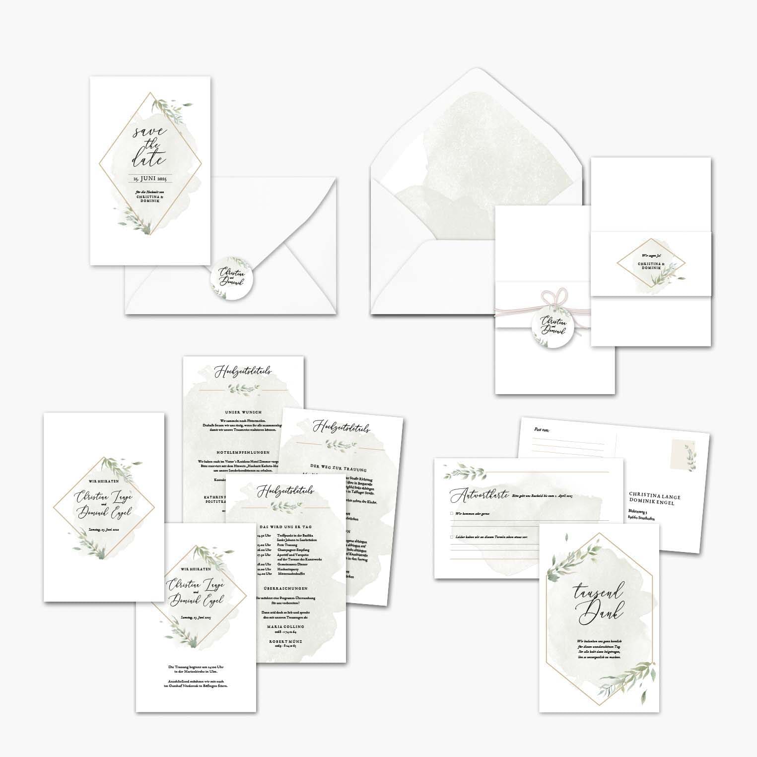 Damit ihr eure Hochzeitseinladung und alle weiteren Hochzeitskarten mit absolut professionellem Look im Handumdrehen selbst gestalten könnt, haben wir für euch großartige Vorlagen erstellt, die ihr ohne Grafikprogramm an eurem Computer selbst mit eurem individuellen Text beschriftet.