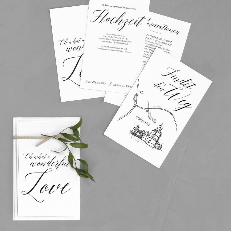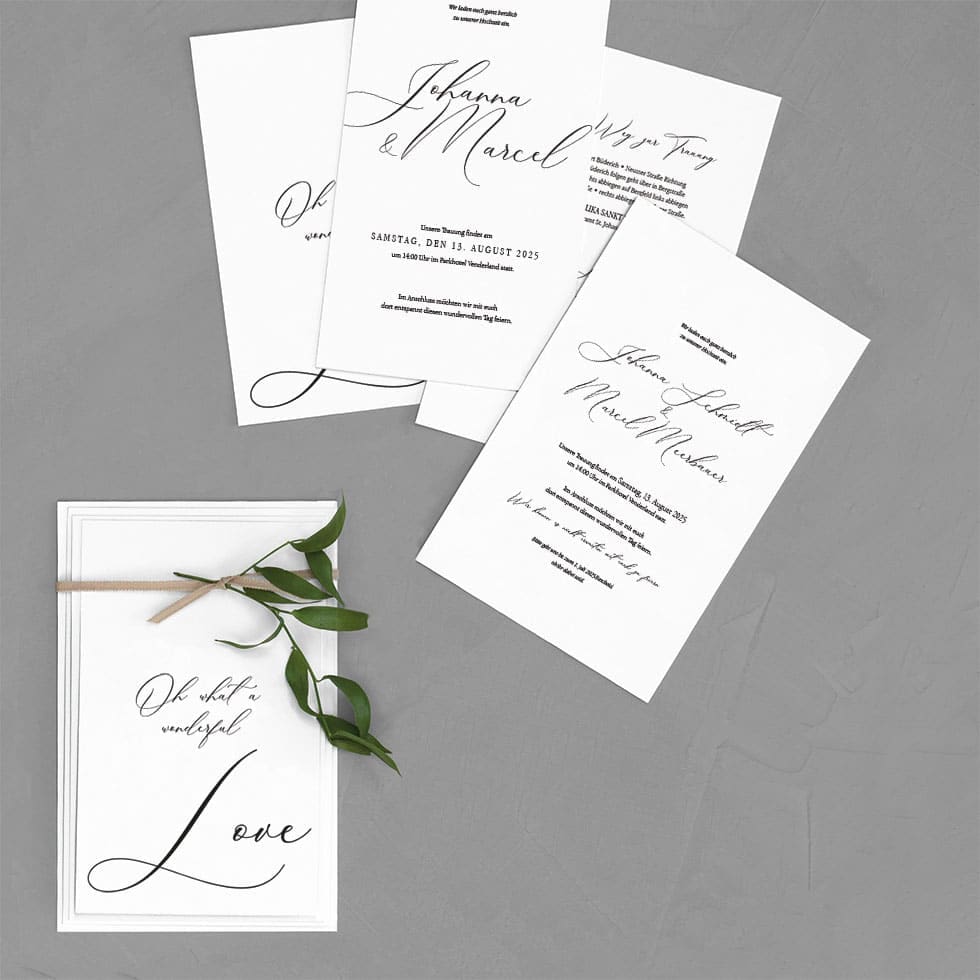 Gestaltet im Handumdrehen wundervolle Kalligraphie Hochzeitskarten sowie alle Accessoires selbst und lasst eure Karten professionell drucken.