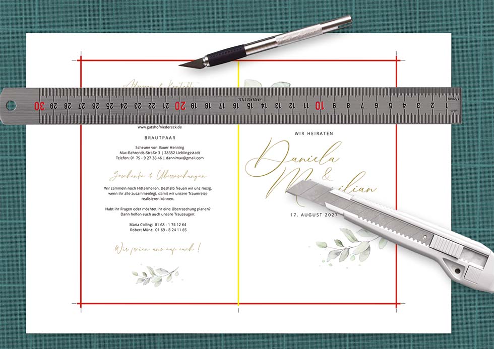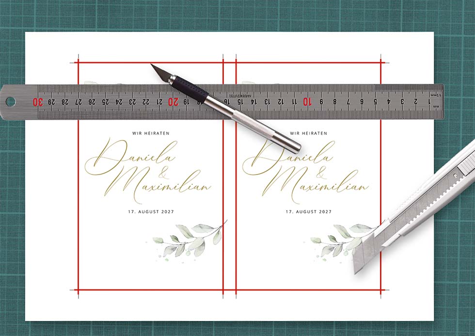 Bei unseren Kartenvorlagen legen wir deshalb für Einzelkarten die Druckdateien mit Schnittmarken wie unten gezeigt. Die rote Linie markiert, wo ihr schneidet: