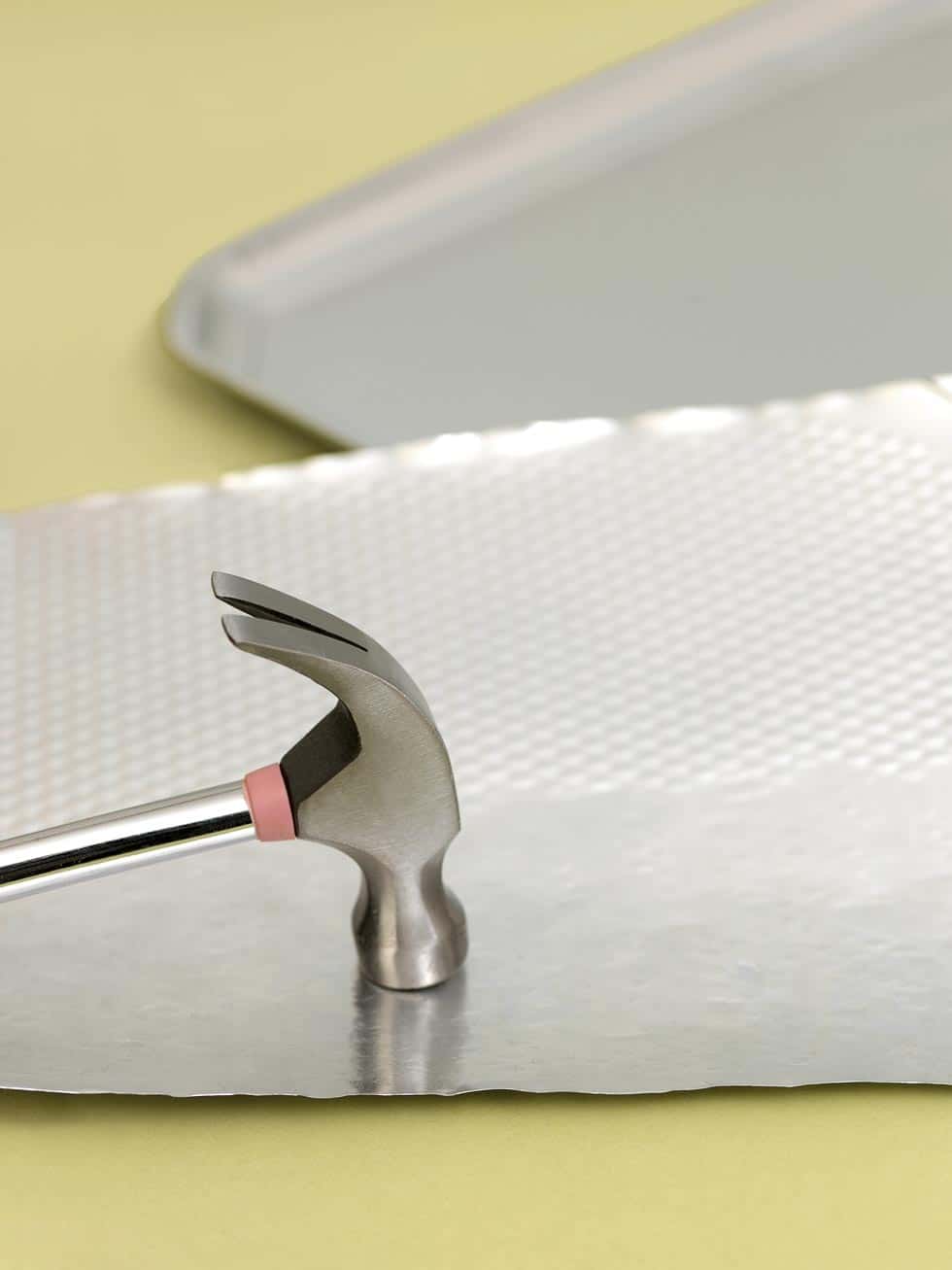 Wir nehmen als Ausgangsmaterial eine Aluschale, die beim Grillen häufig verwendet wird und geradzu überall erhältlich ist. Klopft die Aluschale mit einem Hammer flach, damit die Struktur geglättet.