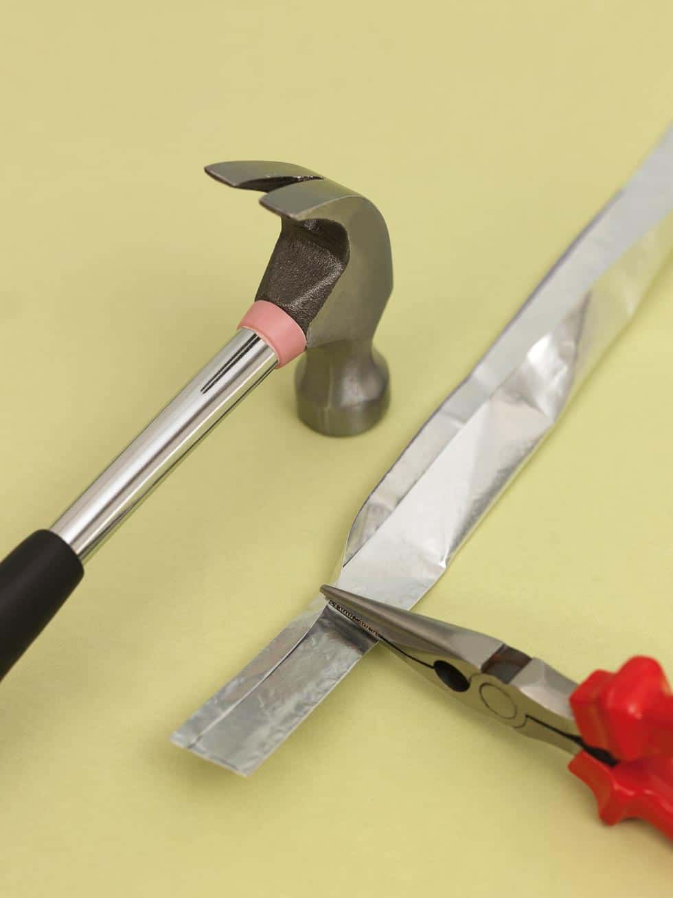 Schneidet daraus einen Streifen in gewünschter Breite und faltet ihn, wie im Bild gezeigt von unten nach oben. Lasst aber am oberen Rand etwas Material übrig. Klar, dies dient dazu, das Material zu verstärken. Jetzt faltet ihr mithilfe einer Zange das obere Stück darüber und klopft alles noch einmal flach.