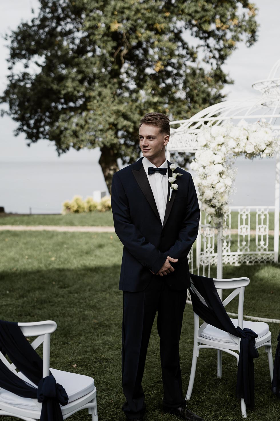 Der Bräutigam trägt zu einer klassischen Hochzeit einen eleganten, zart glänzenden Anzug in gedeckten Farben mit passender Weste und Plastron oder Fliege. Ganz klassisch bietet sich alternativ auch ein Cut für die Trauung und ein Smoking für den Abend an.