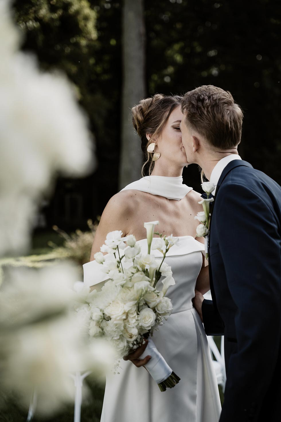 Bei einer klassischen Hochzeit trägt die Braut ein weißes, elegantes Brautkleid in A-Linie oder ein schmales modernes Brautkleid – optional mit eleganten aber schlichten Details von Spitze bis Perlen. Wollt ihr es romantischer bietet sich ein Princess-Dress oder ein Kleid mit Schleppe an.