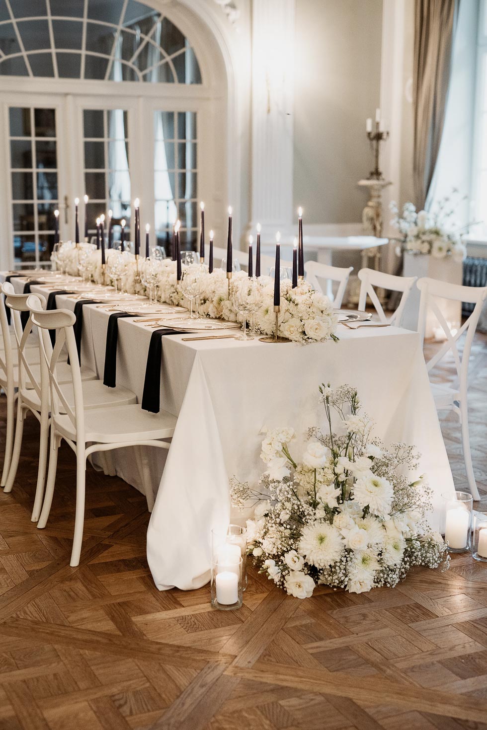 Üppige Blumengestecke aus unterschiedlichsten Blüten und viele Kerzen schaffen den perfekten Rahmen für die klassische Hochzeit und schenken der Trau- und Festlocation ein besonderes Ambiente.