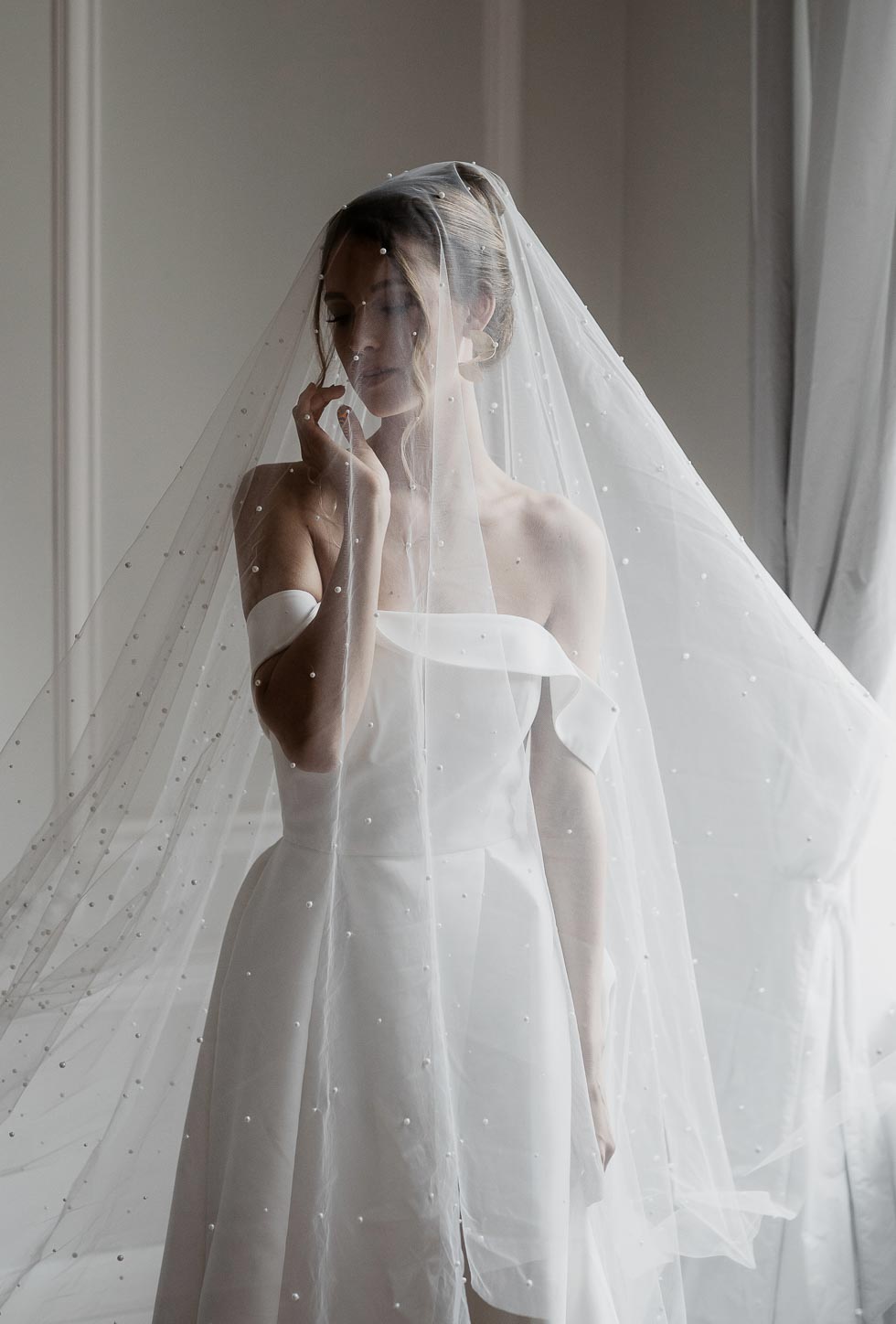 Darüber hinaus runden schlichte Accessoires, wie Perlenohrringe oder ein Schleier das klassische Braut-Outfit ab.