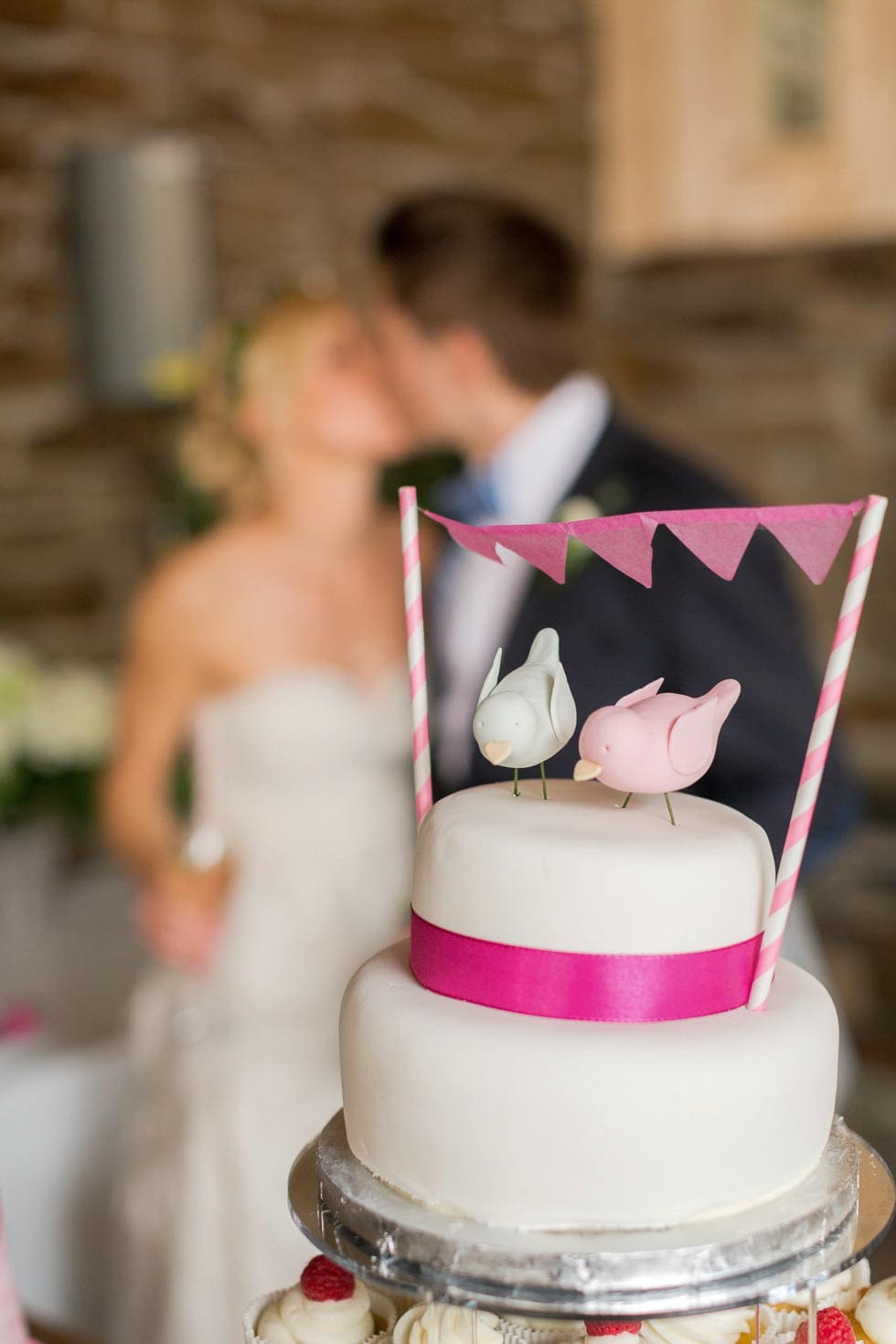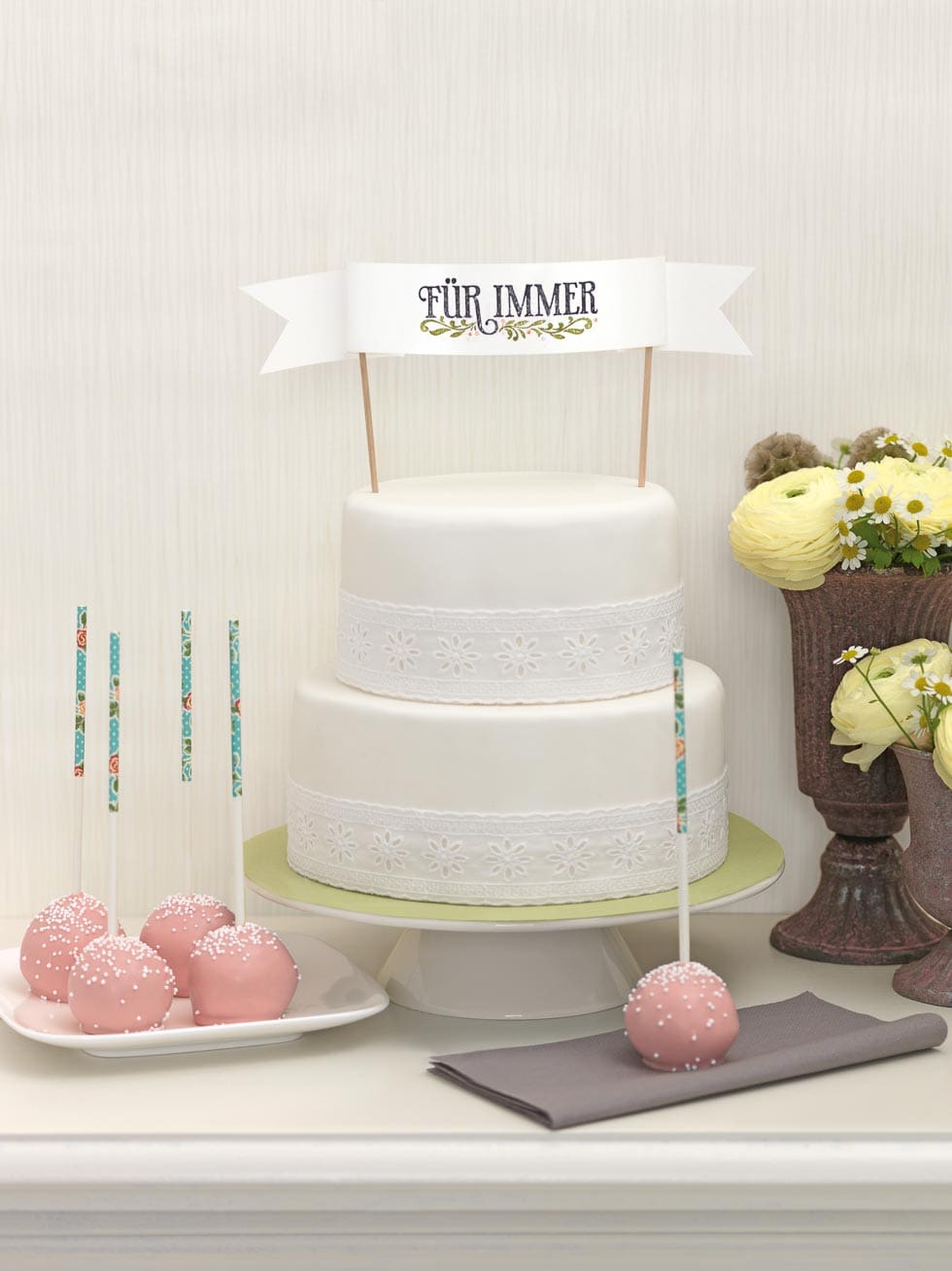 Zum Beispiel mit dezenten frischen Blumen, Gräsern oder einem besonderen Cake Topper.