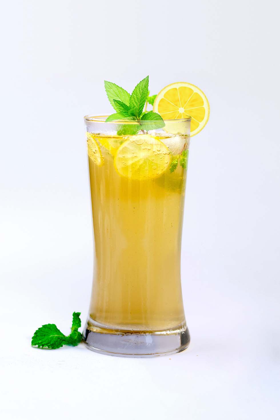Für ein Glas Limonade 60 ml Sirup mit Mineralwasser oder Ginger Ale aufgießen, Eis ergänzen und mit frischen Zitronenscheiben dekorieren.