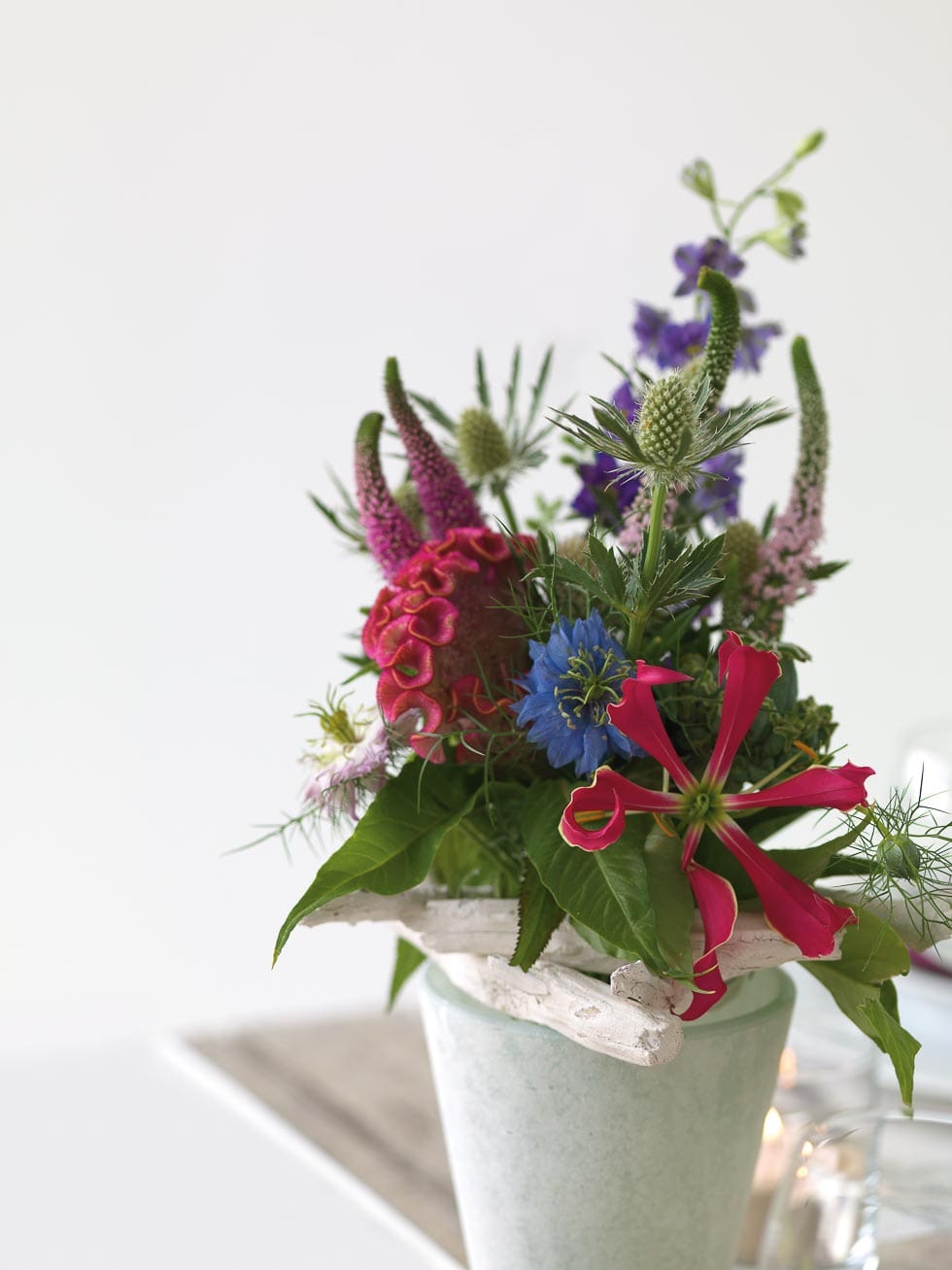 - Jetzt setzt ihr noch ein paar Farbtupfer: Arrangiert die Hahnenkämme und Gloriosa asymmetrisch, damit es spannend bleibt.
