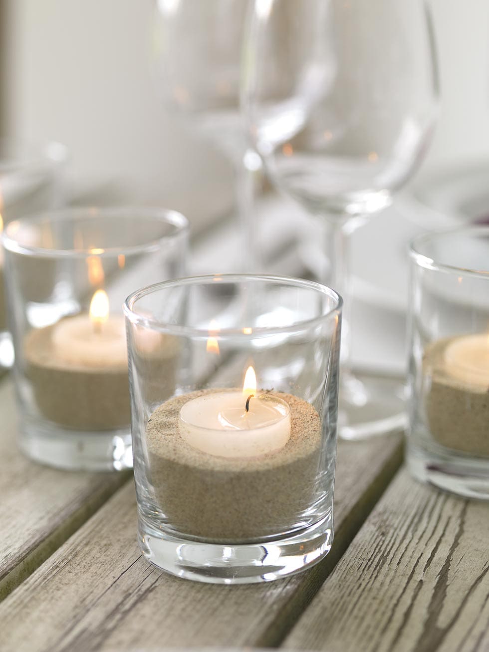 Einfache Trinkgläser, die man im Partyverleih sogar preiswert mieten kann, haben wir mit Vogelsand gefüllt und Teelichter mit transparenter Hülle* hineingestellt.