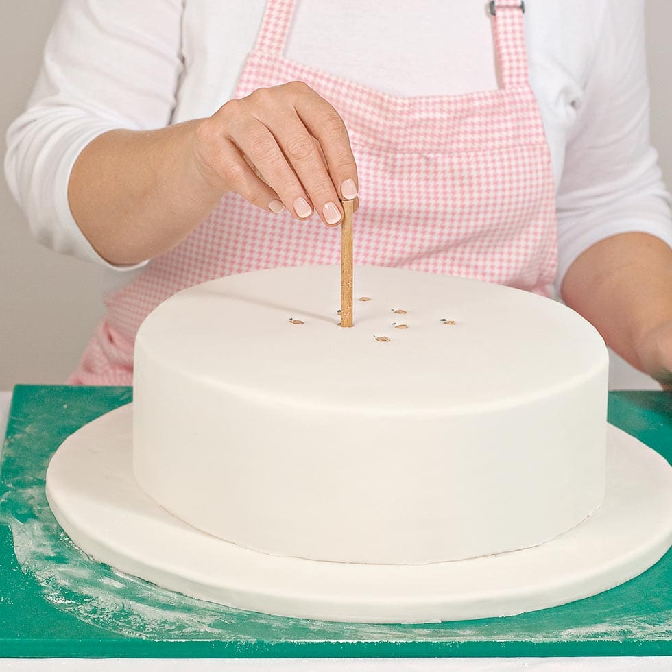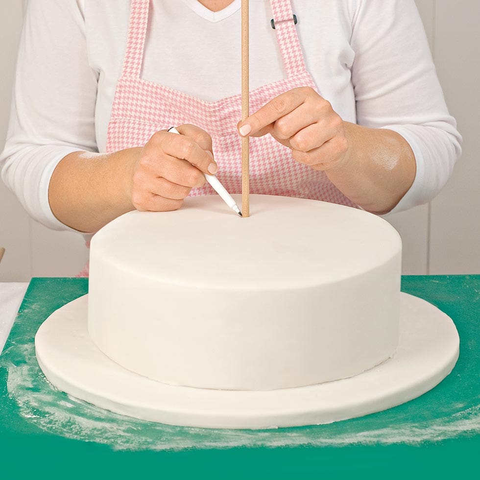 Steckt ein zuvor abgewaschenes Buchen-Rundholz von 8 mm Durchmesser in die Torte und markiert die Höhe mit einem Lebensmittelstift.