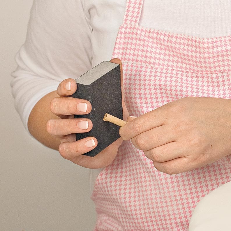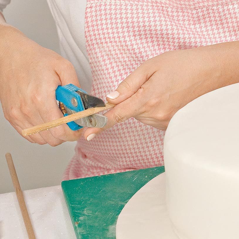 Jetzt den Holzstab anspitzen, damit er auch durch die einzelnen Cake Boards geschlagen werden kann.