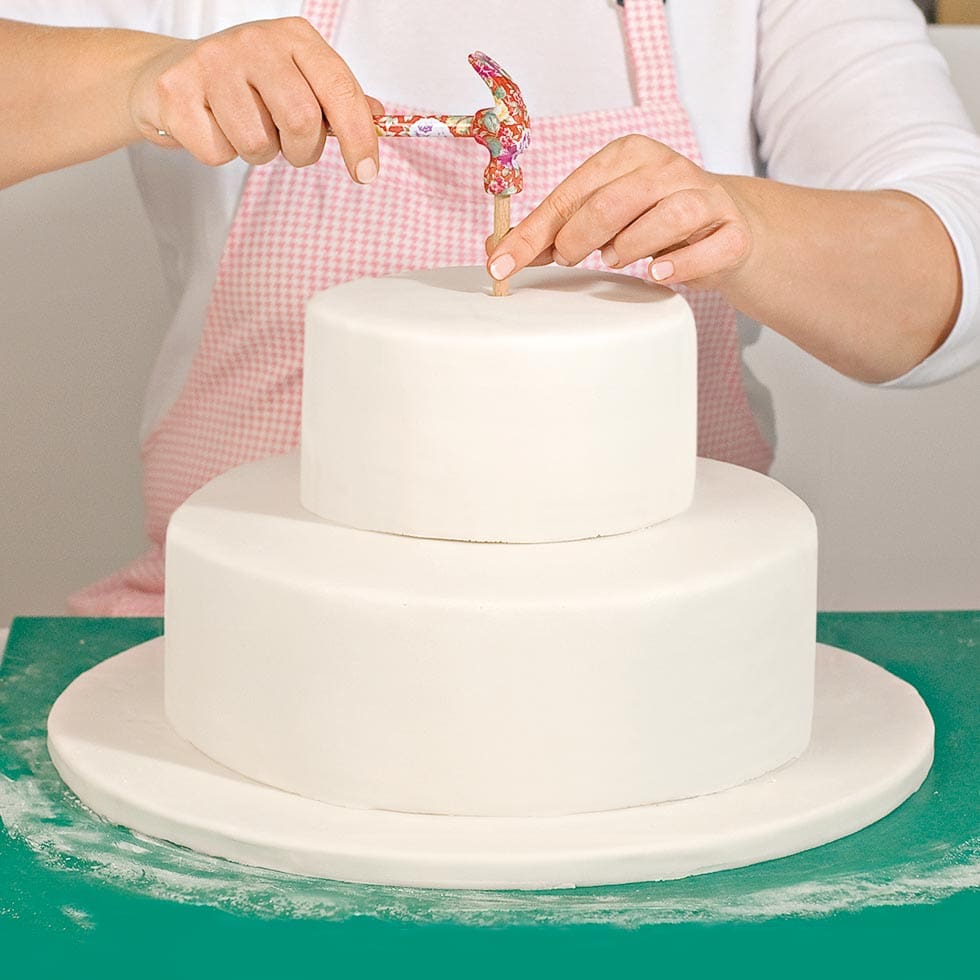 Damit die Tortenstufen nicht verrutschen können, wird zum Schluss ein langer Holzstab durch alle Stufen geschlagen.