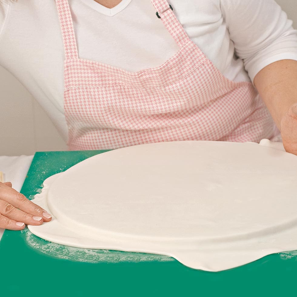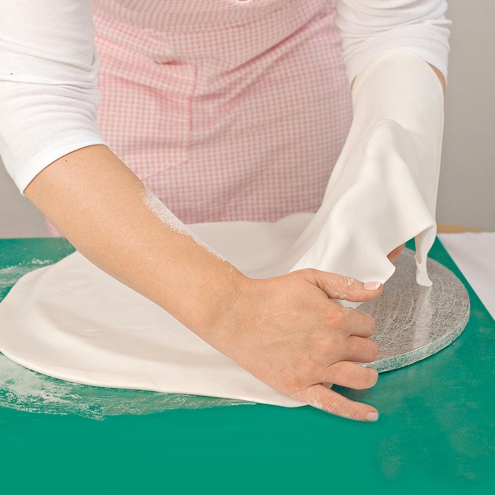 Rollt den Fondant aus und legt ihn über das Board. Alternativ könnt ihr auch fix und fertig ausgerollten Fondant kaufen.