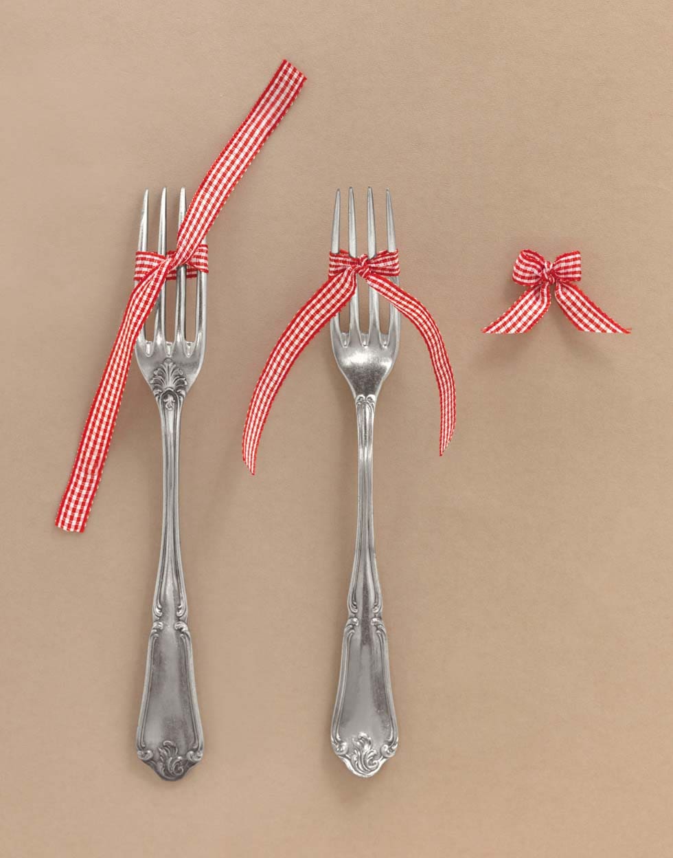 - Führt das obere Ende über die Gabel und durch die mittleren Zacken nach vorne.