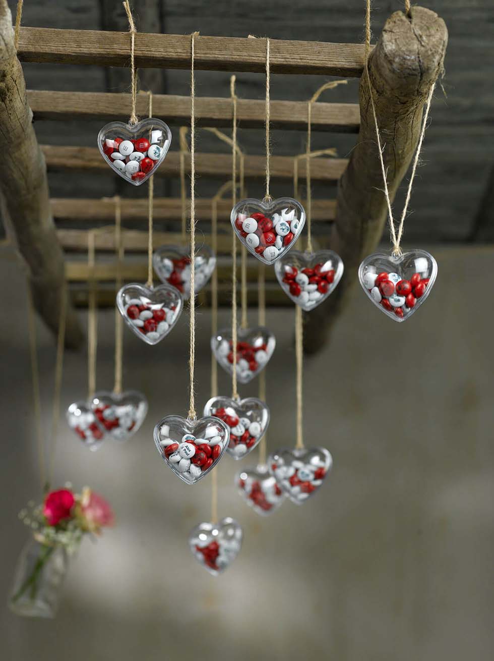 Hängt doch beispielsweise eure individuell gestalteten Schokolinsen über der Candy Bar auf, damit sich die Gäste ein Herz oder eine Kugel "pflücken" können. Oder stellt eine große Vase gefüllt mit Ästen auf den Gästebuch-Tisch. So können eure Gäste beim Eintragen ins Gästebuch etwas Süßes knabbern.