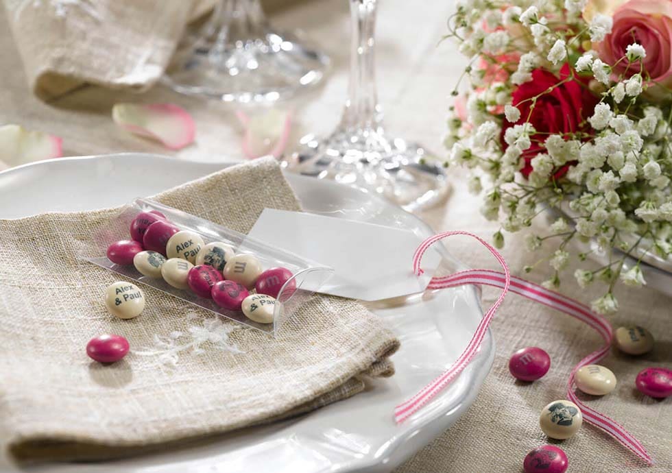 Gibt es jemanden, der keine M&Ms mag? Wohl kaum! Und genau deshalb sind die süßen my M&Ms, die ihr passend zu euren Hochzeitsfarben auswählen und sogar mit einem individuellen Aufdruck ganz persönlich gestalten könnt, auch nach wie vor so angesagt. Als Geschenk, als Gastgeschenk oder für die Candybar.