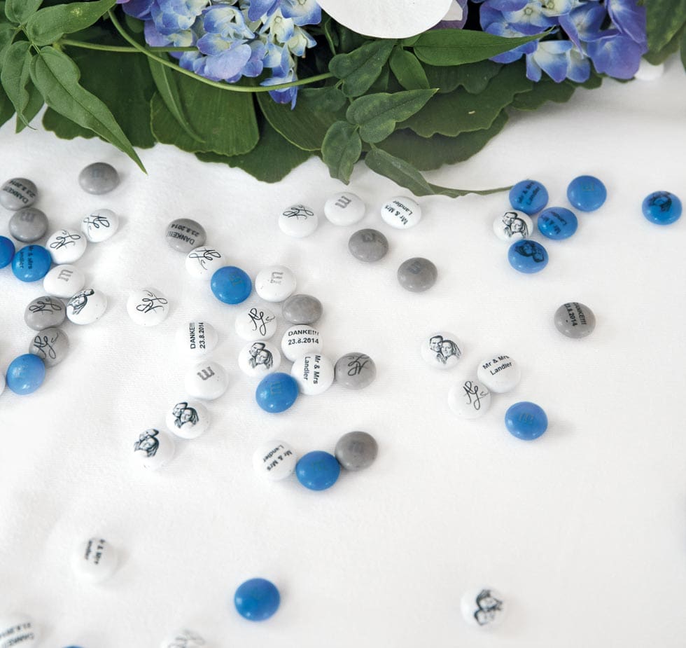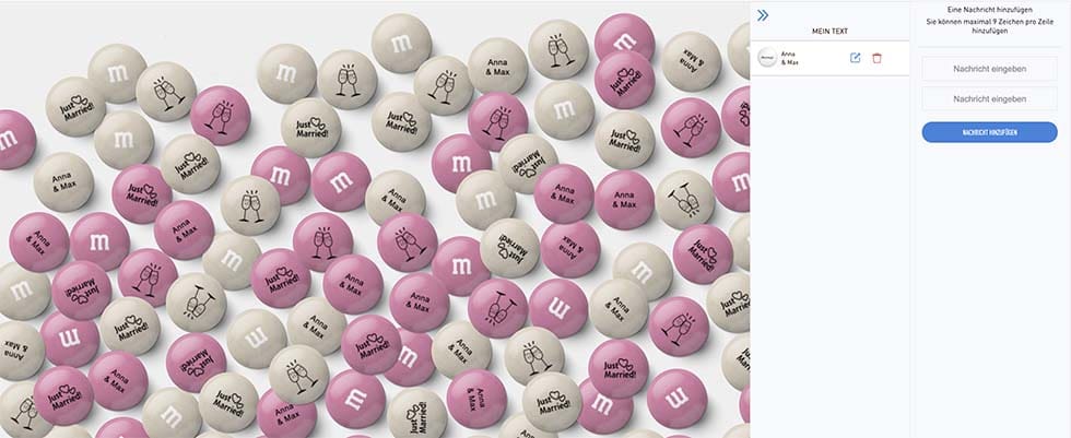 In zwei Zeilen könnt ihr jeweils bis zu 9 Zeichen eingeben, um eure M&Ms mit persönlichen Botschaften zu bedrucken. Natürlich bieten sich eure Namen und das Hochzeitsdatum an. Aber es gibt noch viel mehr Möglichkeiten, die eure Schokolinsen wirklich genial machen.