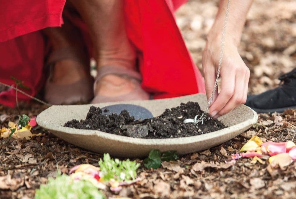 Unsere Ringe wurden durch diese vier Elemente geweiht, indem Sie auf einer Kette aufgefädelt durch die Schalen gezogen wurden.“