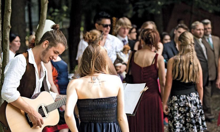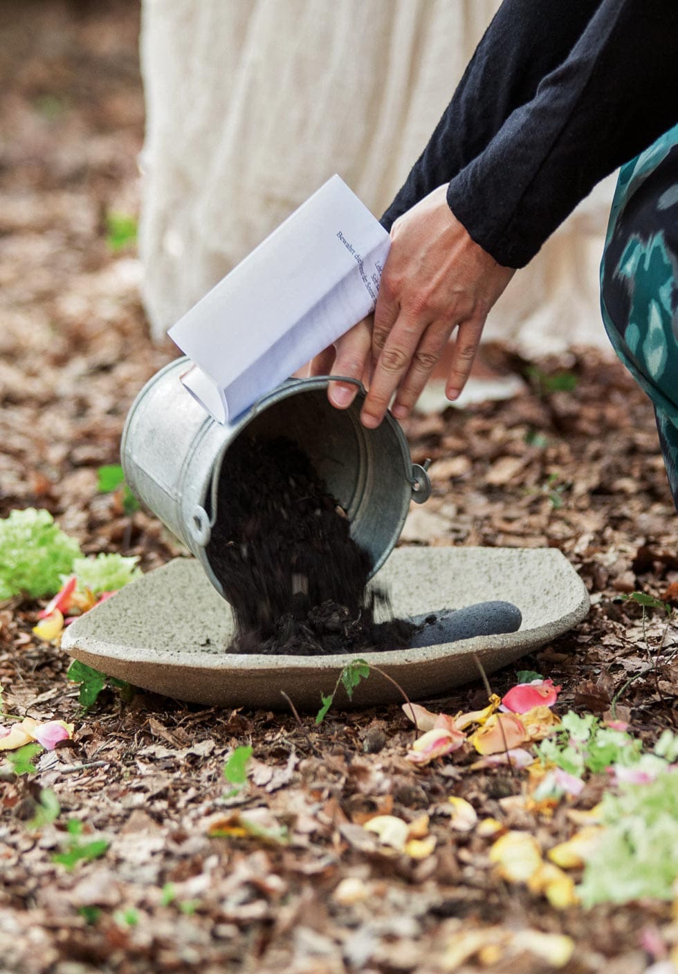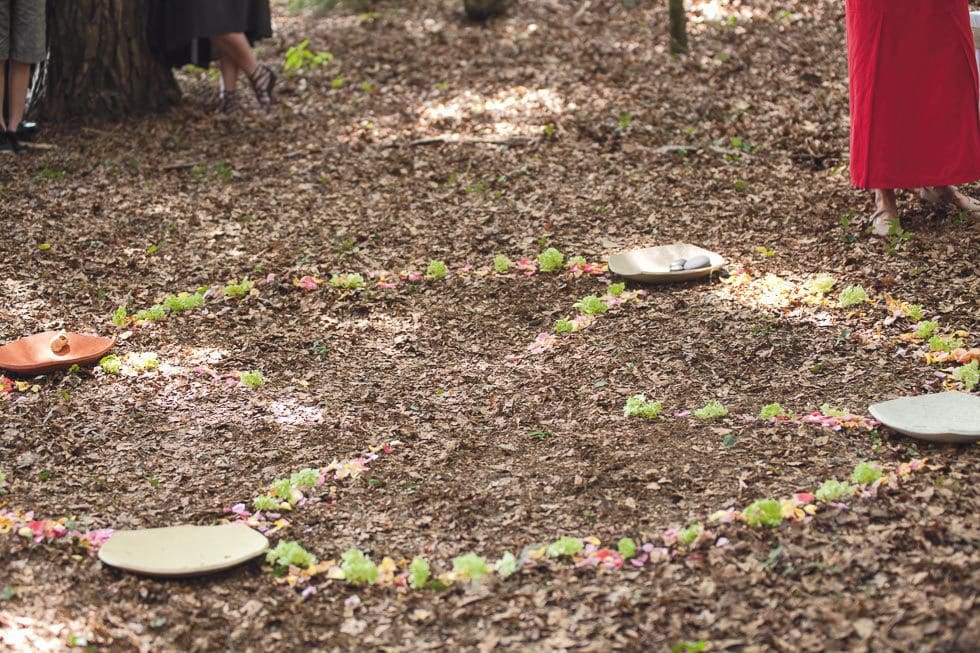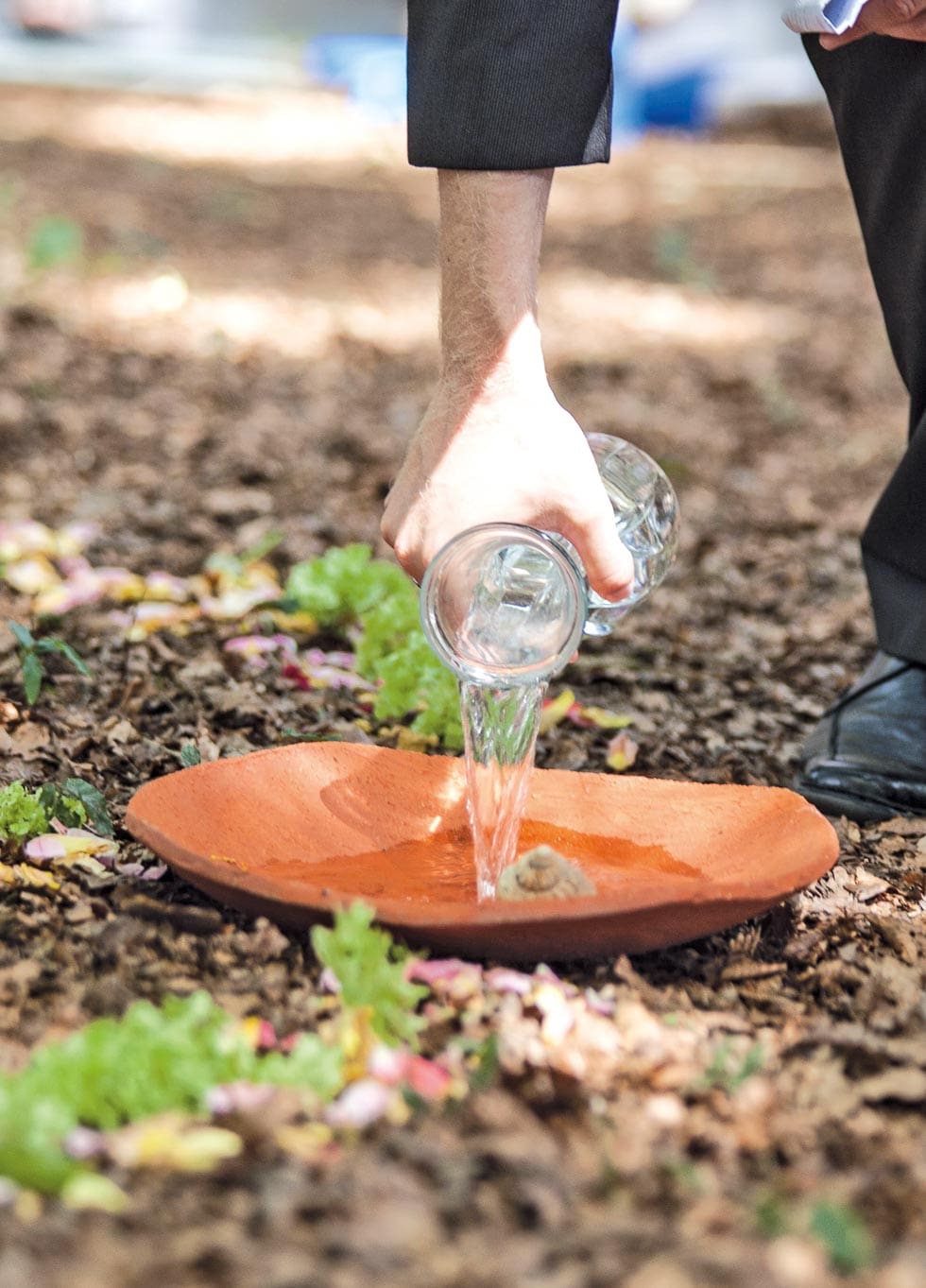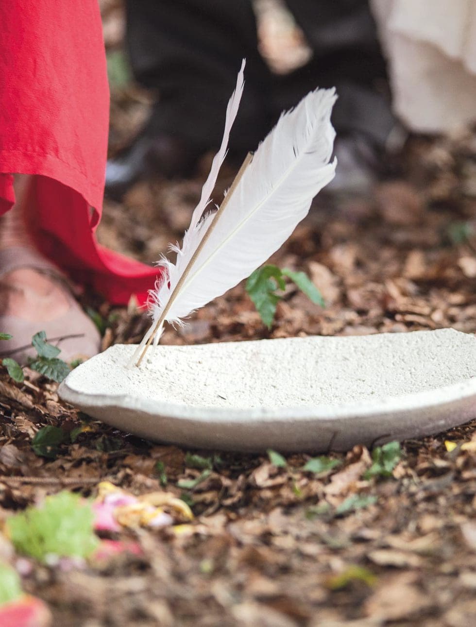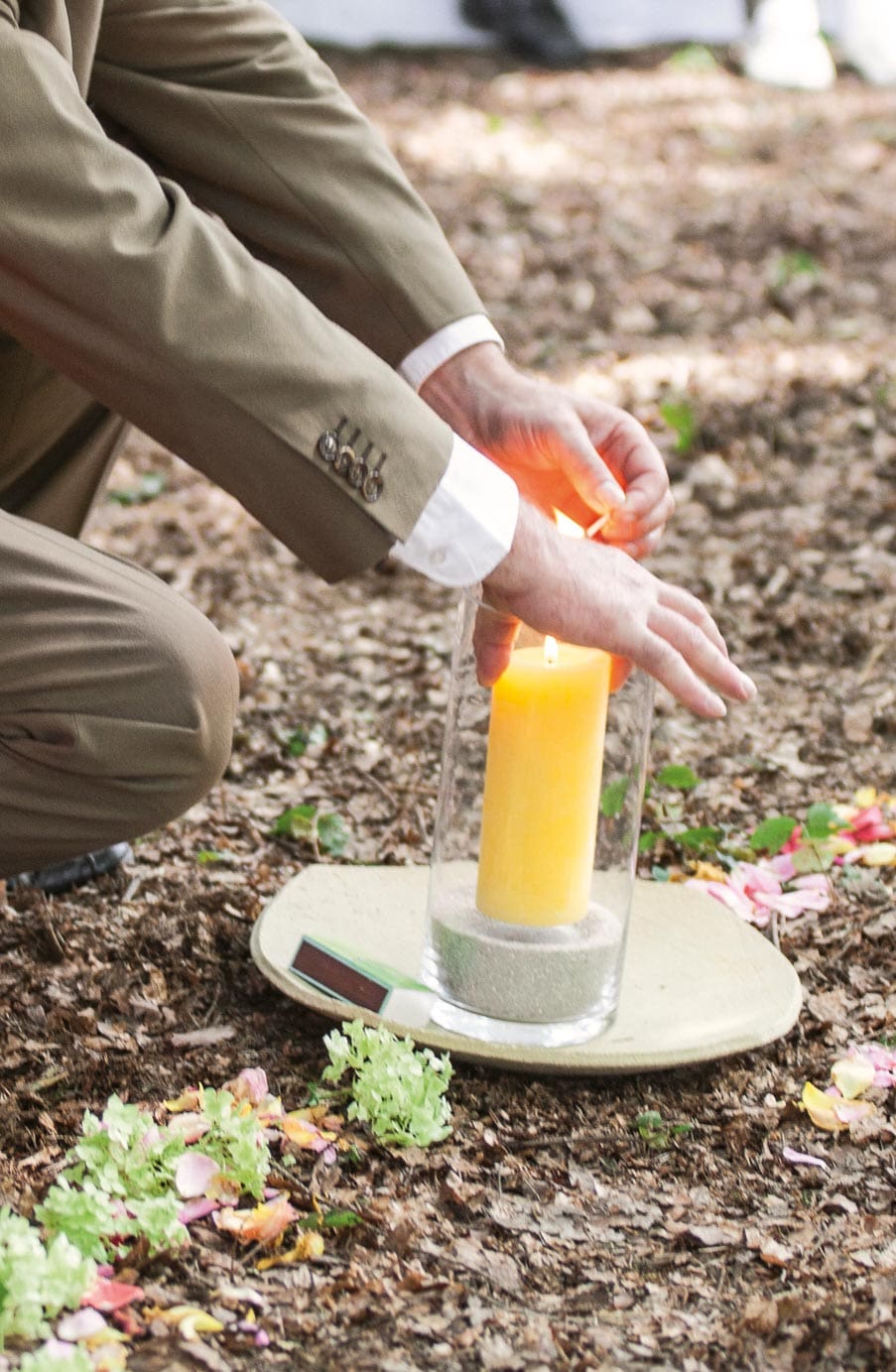 Die Trauung wurde mit einem spirituellen Kreis von Solveig Andrea Huber begleitet. „Uns war eine Zeremonie mit den vier Elementen der Natur sehr wichtig." „Stark und schützend, sanfte Triebe – uns‘re Ehe, uns‘re Liebe“ waren Andreas Worte für ihren Trauspruch.