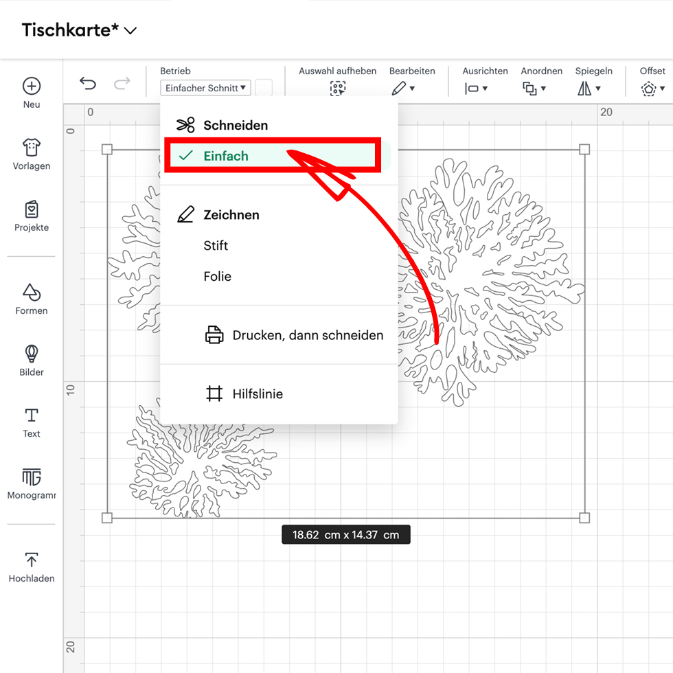 Anschließend wählt "Einfacher Schnitt". Schon ist alles vorbereitet und ihr könnt eure Deko Elemente aus Papier schneiden.