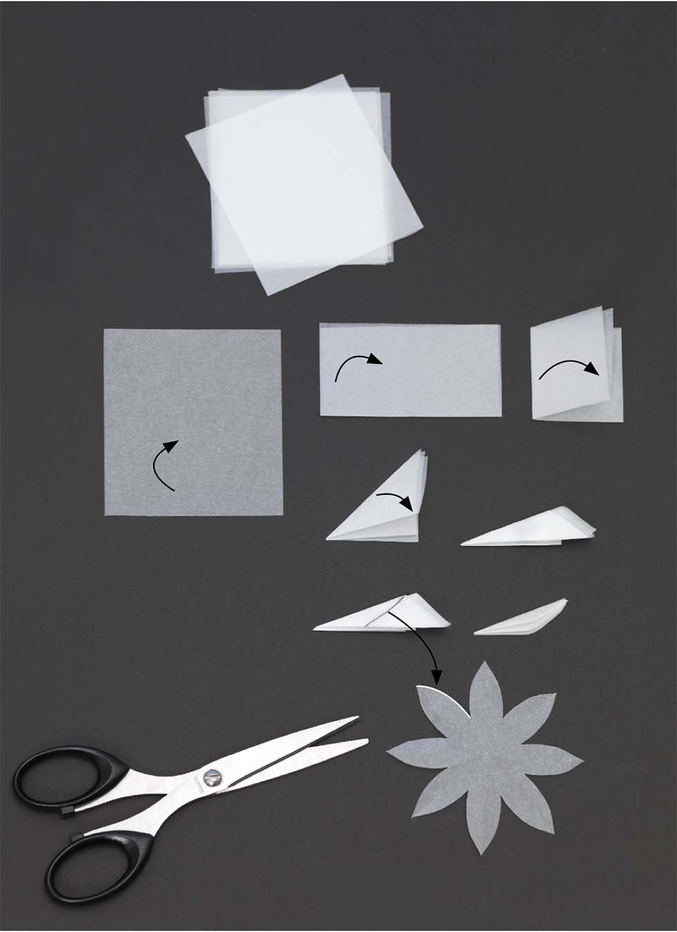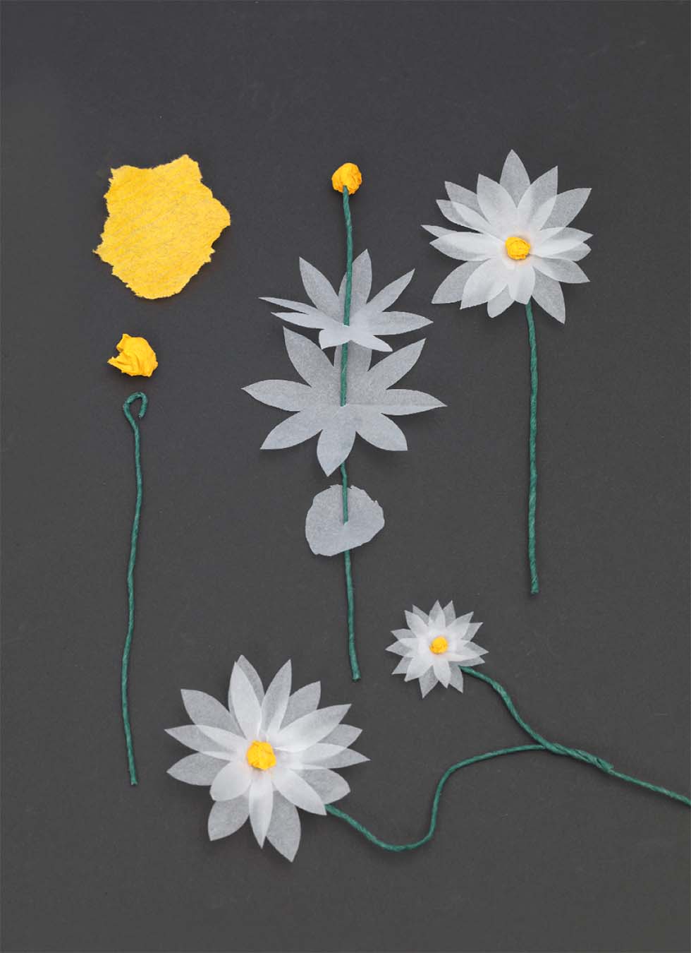 - Für das Arrangement der Blüten benötigt ihr zwei verschiedene Größen und ein Stück Seidenpapier, das unter die Blüten geklebt wird.