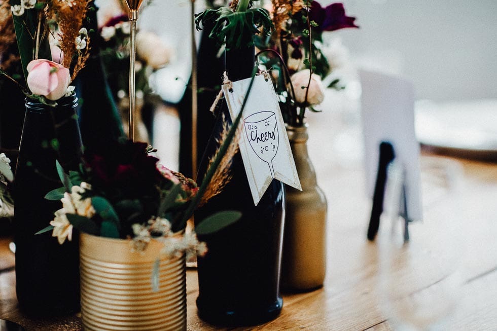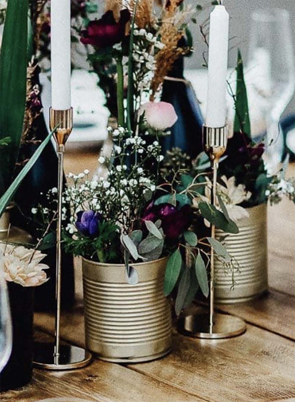Sammelt ein paar dunkle Flaschen – sogar Bierflaschen bieten sich wunderbar an – und besprüht sie eventuell mit goldenem Lack. Auch lackierte Konservendosen ergeben bereits eine preiswerte und perfekt passende Deko für den Polterabend.