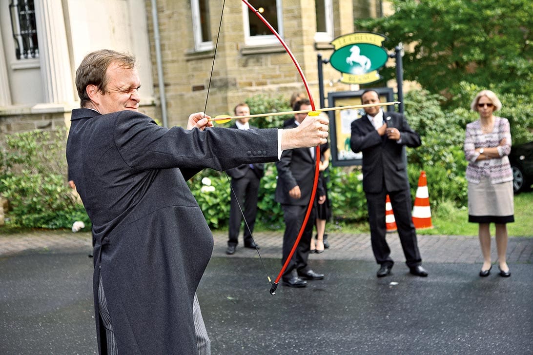 Bogenschießen ist genial, weil es eine nicht alltägliche Aktion ist. Denn hier werden sich die Gäste sicherlich darum schlagen, auch einmal mit Pfeil und Bogen schießen zu dürfen. Und das gibt wieder einen Beitrag in die Hochzeitsreise-Kasse.