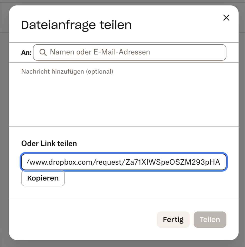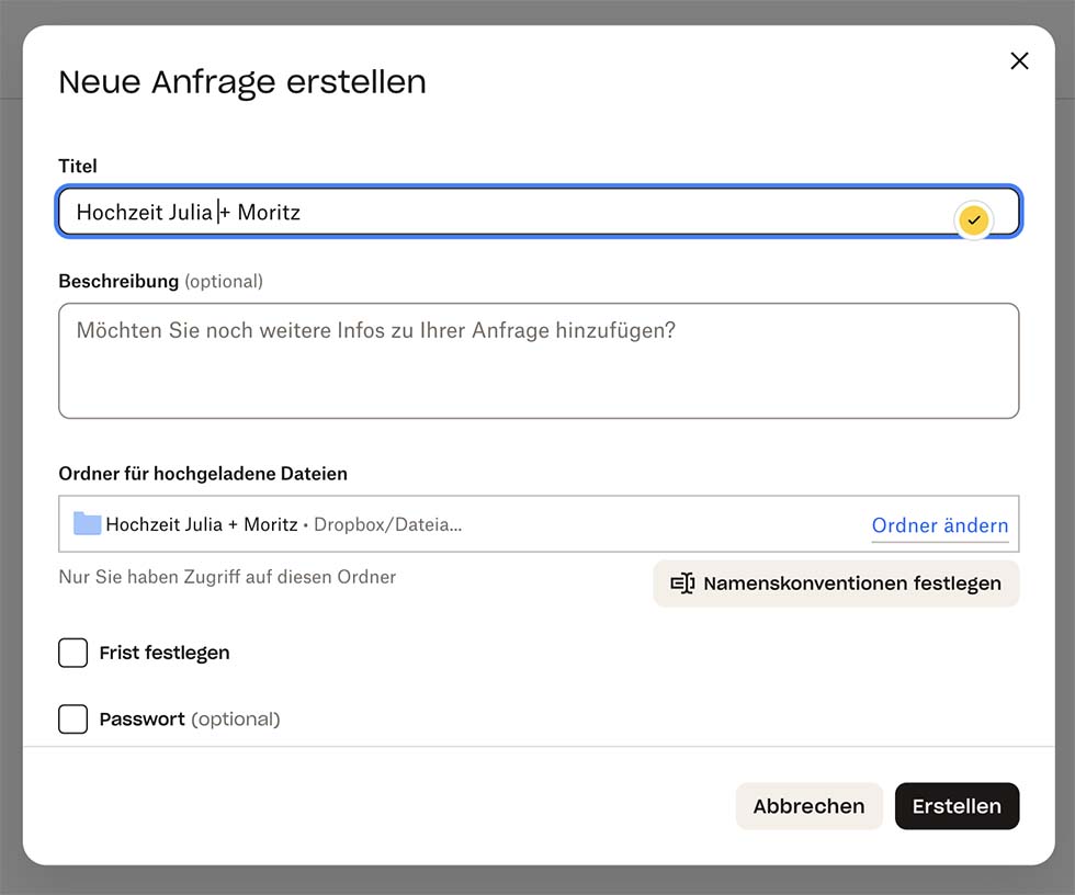 3. Gebt einen Namen für eure Dateianfrage an und klickt auf "Erstellen".