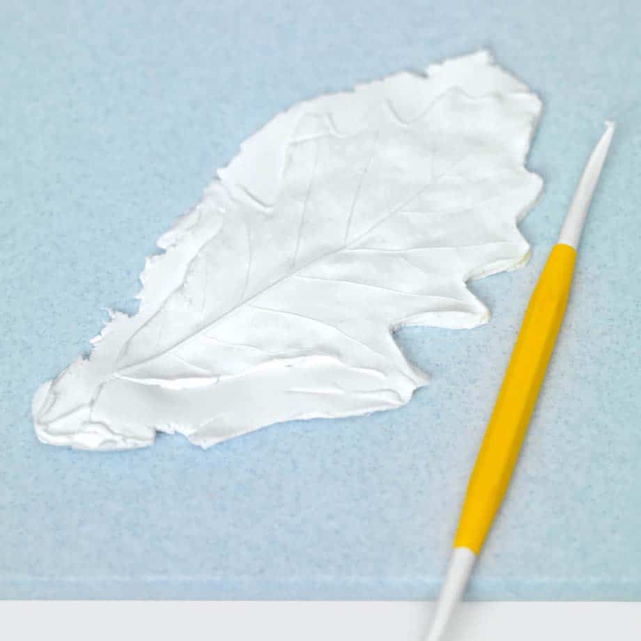 Auf einem Plastikbrettchen die Kontur des Blattes ausschneiden und die Kanten mit einem Modellierholz säubern.