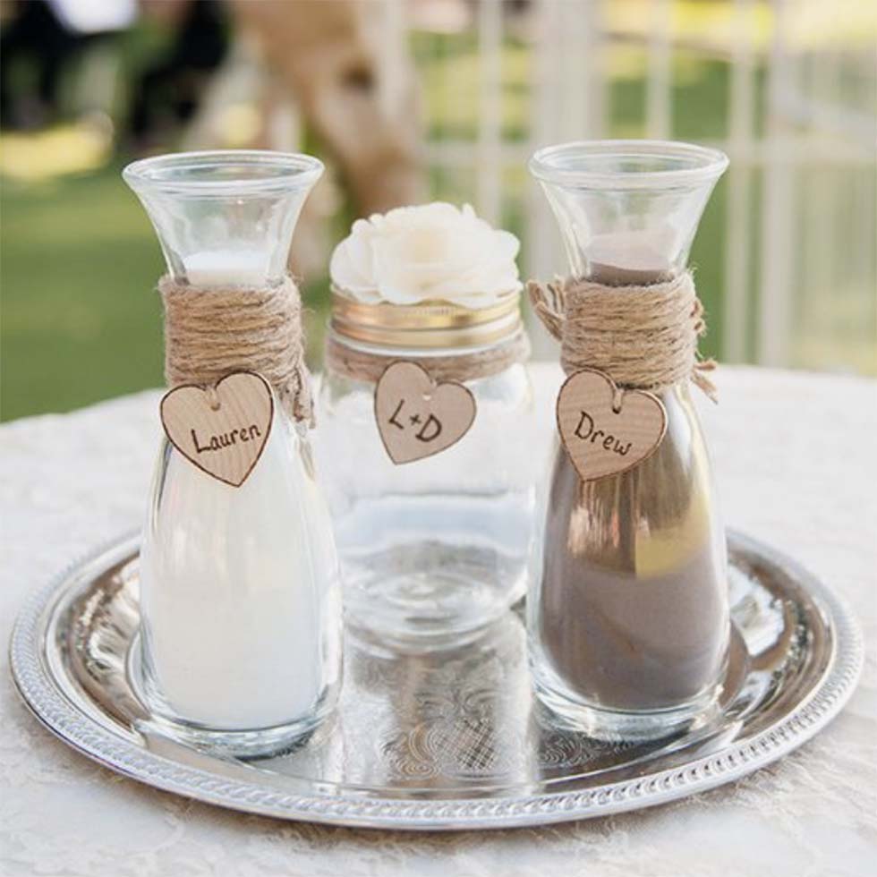- Die Gefäße mit dem Sand könnt ihr mit euren Namen beschriften und auf dem Endergebnis stehen eure Namen, die Anfangsbuchstaben oder euer Hochzeitslogo gemeinsam mit Datum.