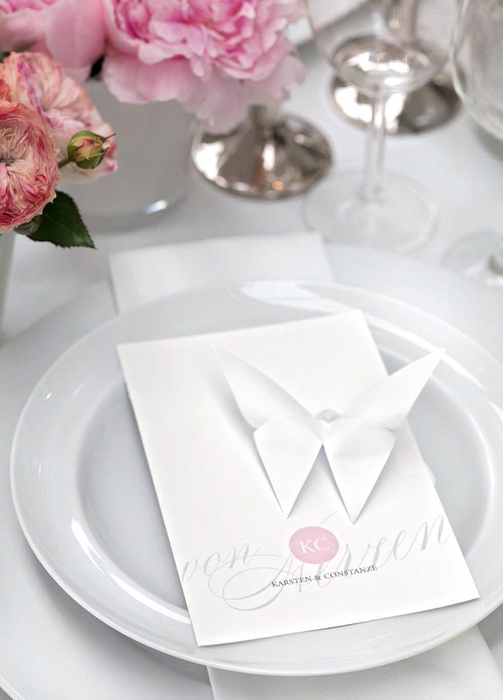 Aber auch als Platzkarte eignen sich die hübschen Falter, wenn man die Namen auf eine Flügelseite schreibt und sie auf der Serviette oder Menükarte platziert. Schön ist aber auch, unten einen Schlitz zu schneiden und die Platzkarten am Glas zu befestigen.