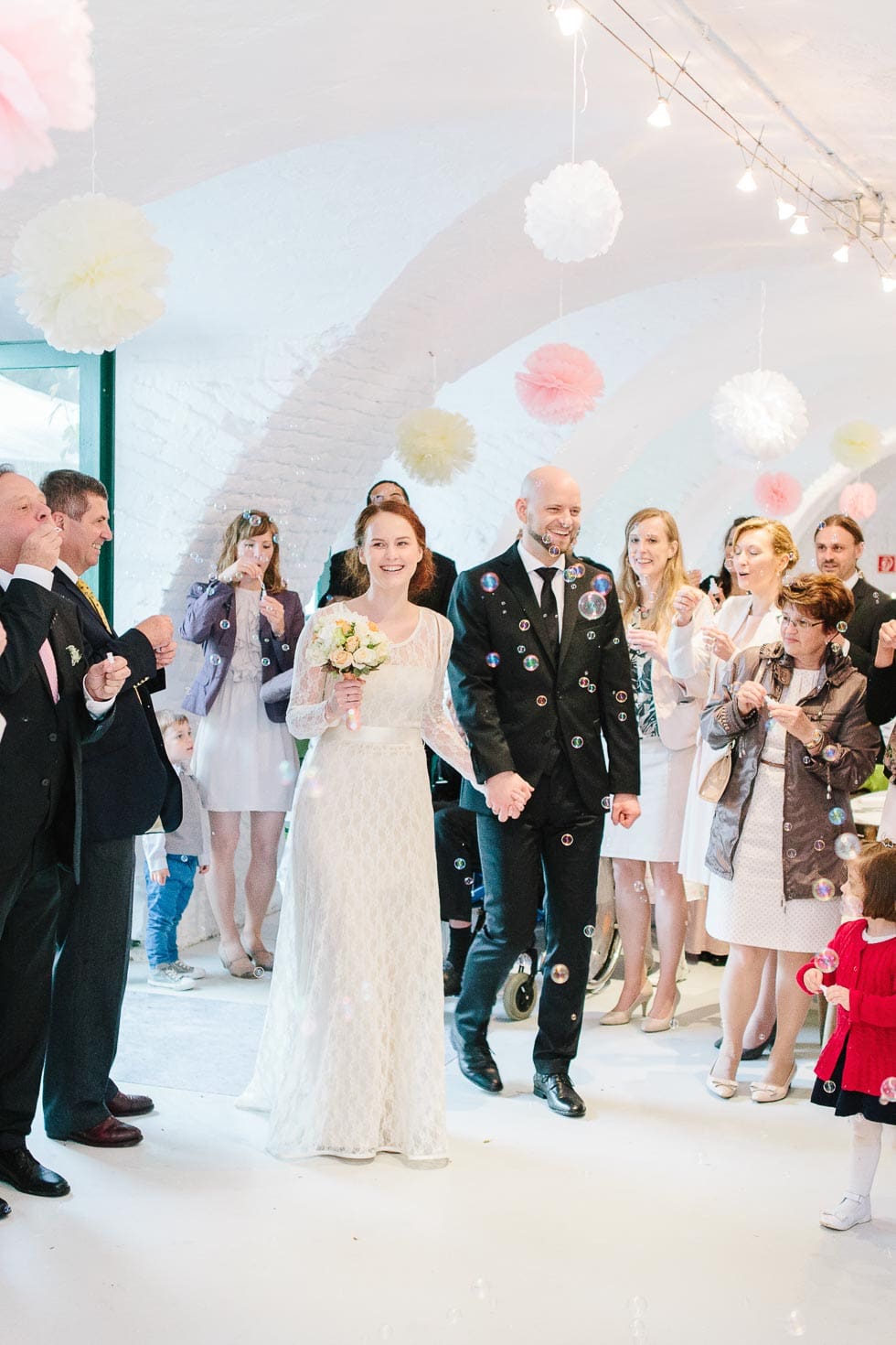 Durch die extrakleine Pust-Öffnung werden unzählige minikleine Seifenblasen produziert, die das Brautpaar umhüllen.