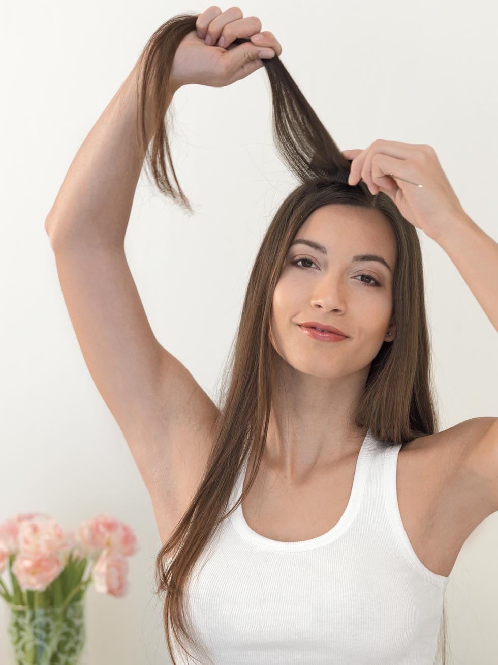 Wenn Ihre Haare etwas kürzer sind als in unserem Beispiel, braucht ihr lediglich einen Strumpf. So erhaltet ihr zusätzliches Volumen ohne lange Haare haben zu müssen: