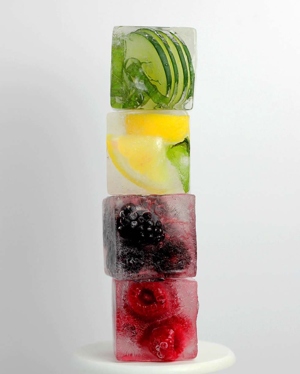 Was macht man, wenn die Lieblingsfrüchte oder -blüten gerade keine Saison haben?Ganz einfach: Friert sie in Eiswürfeln ein. So sind sie lange haltbar, kühlen die Getränke zusätzlich und sind immer eine zusätzlicher Hingucker (siehe Bild unten).